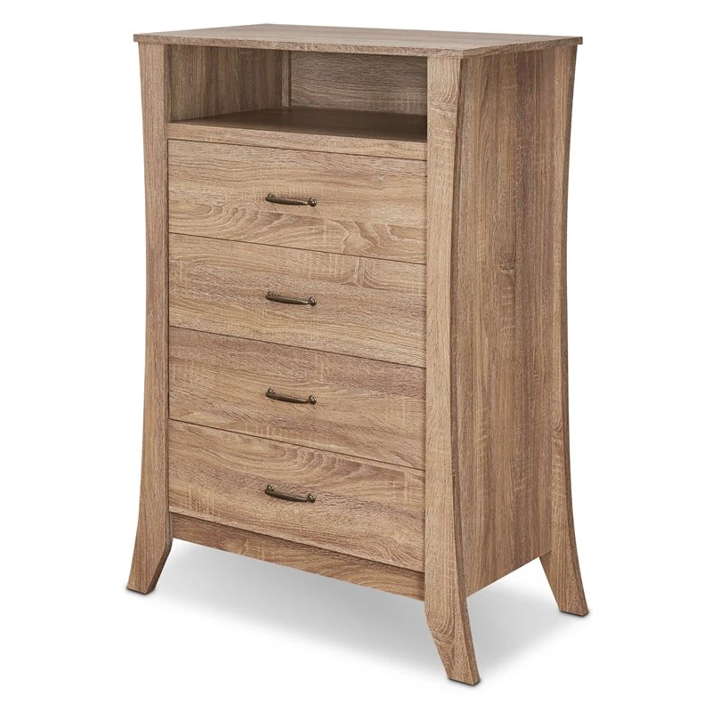 Enlarge your bedroom storage with this Goiot chest. Featuring clean design with tapered legs, this case good provides ample storage with one open compartment and four drawers. With its contemporary style, this chest is perfect for any bedroom.