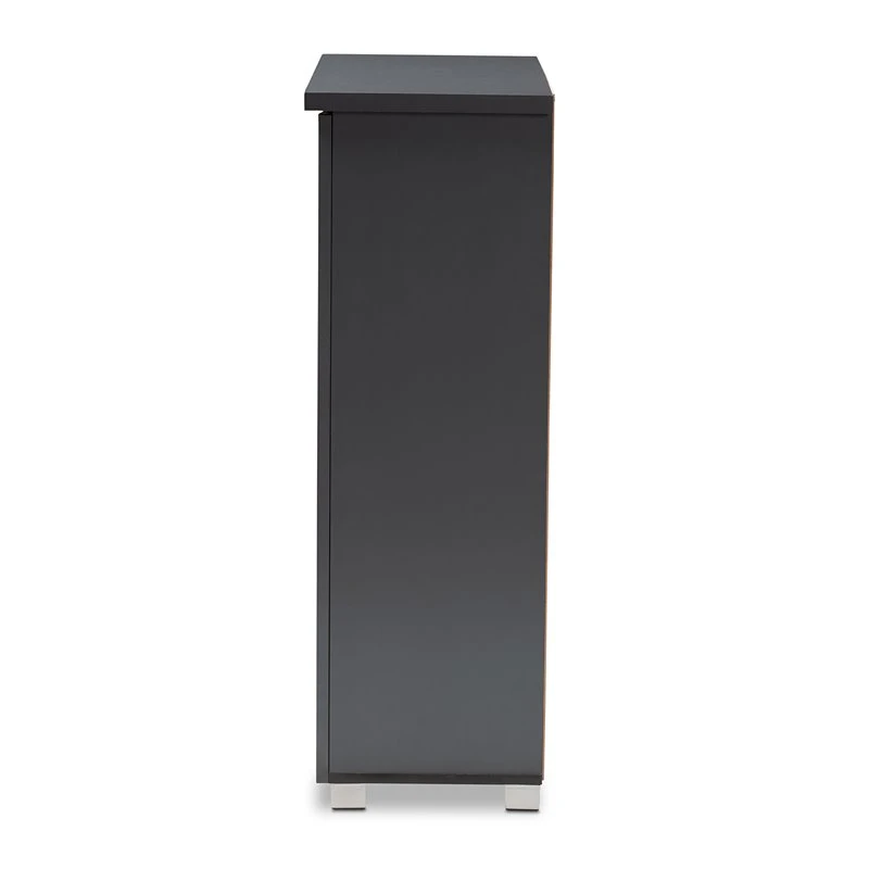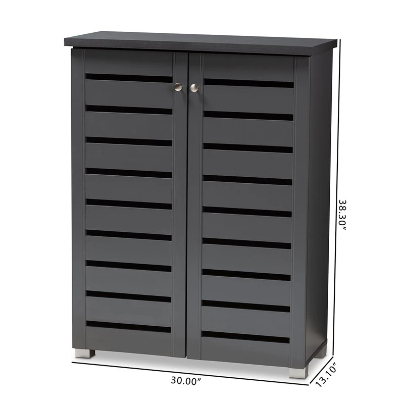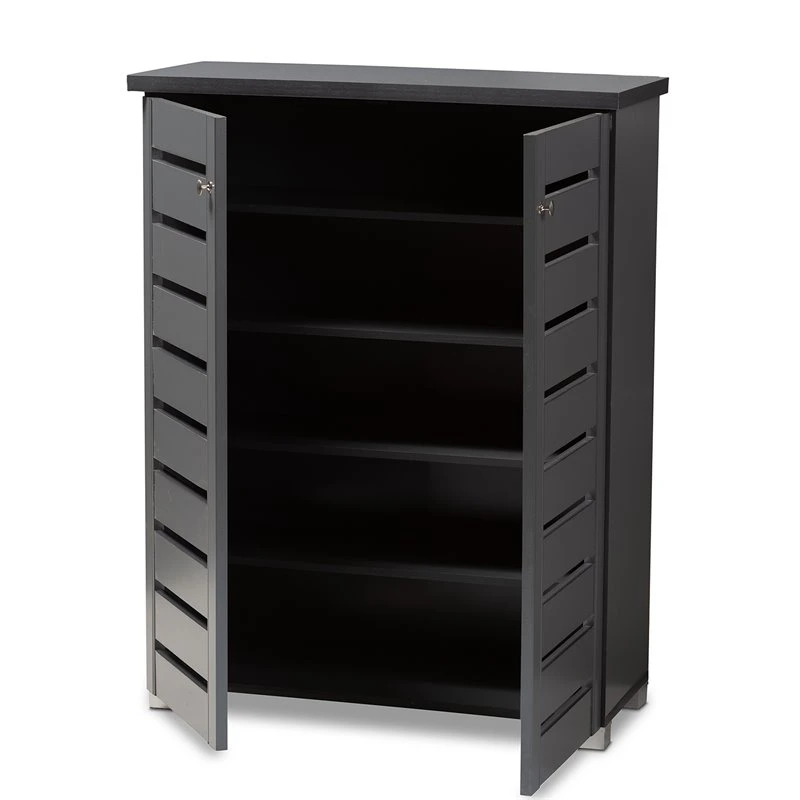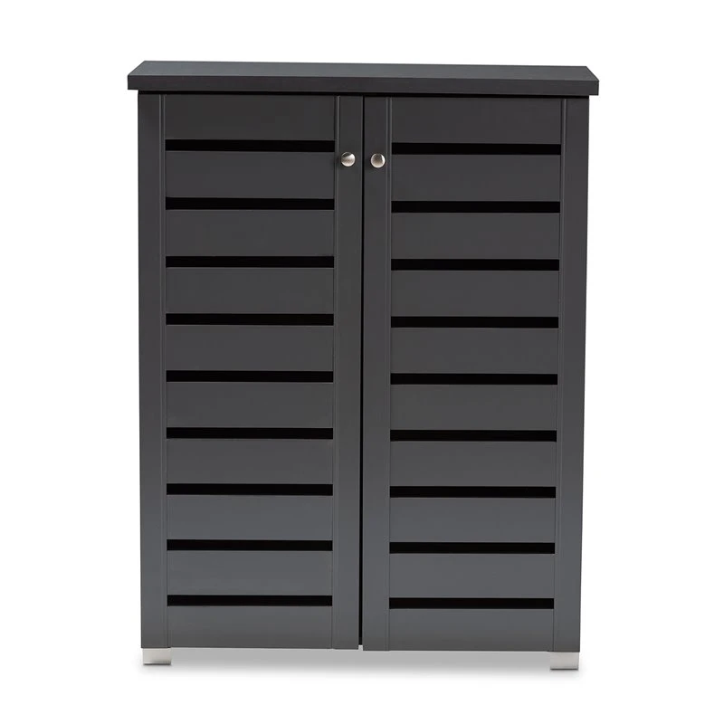 Shoe organization is made easy with the Adalwin cabinet. Featuring a stylish contemporary design and dark grey finish, the Adalwin is easy to coordinate with any style of decor. Two doors conceal four fixed shelves with storage space for up to 15 pairs of shoes. The doors feature open slats to enable air circulation and prevent mold growth on your shoes. The Adalwin cabinet is made in Malaysia and requires assembly.