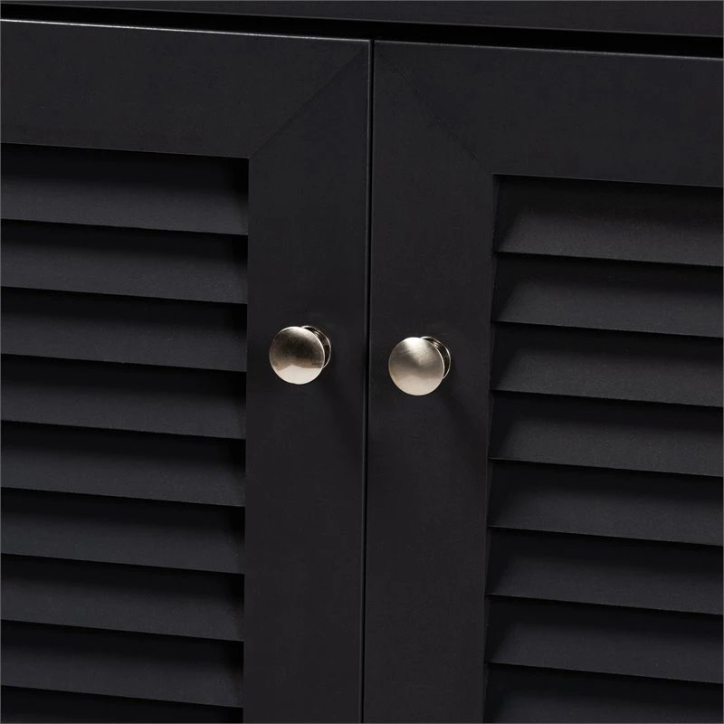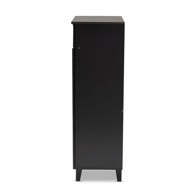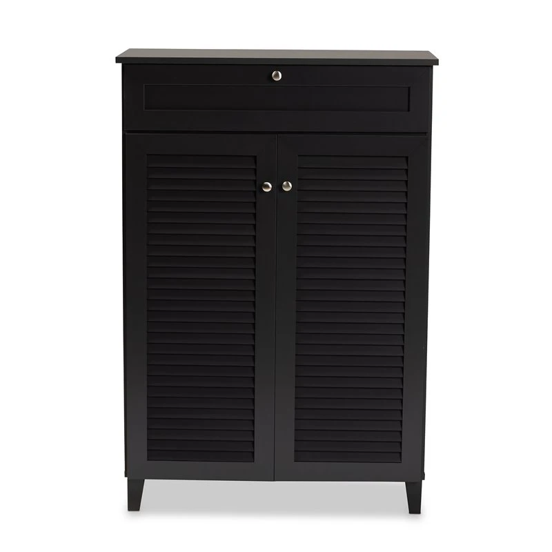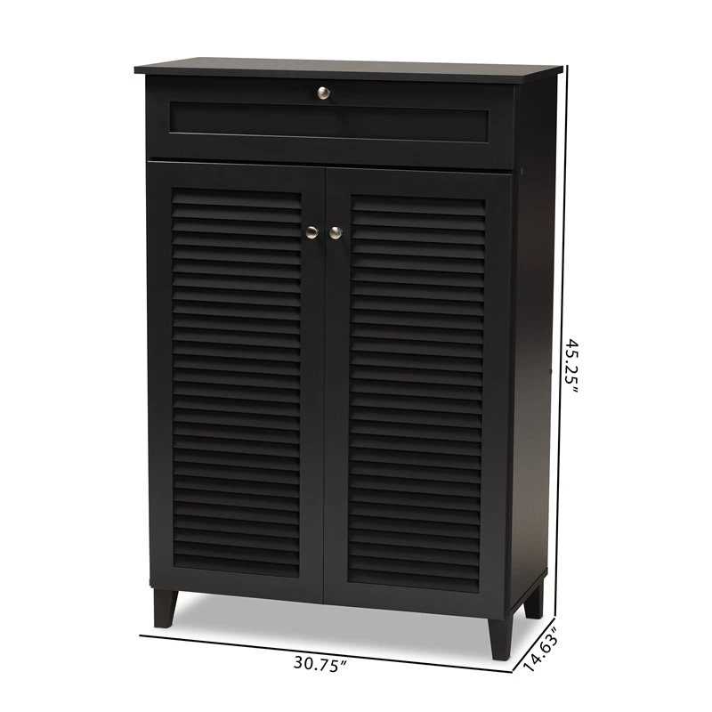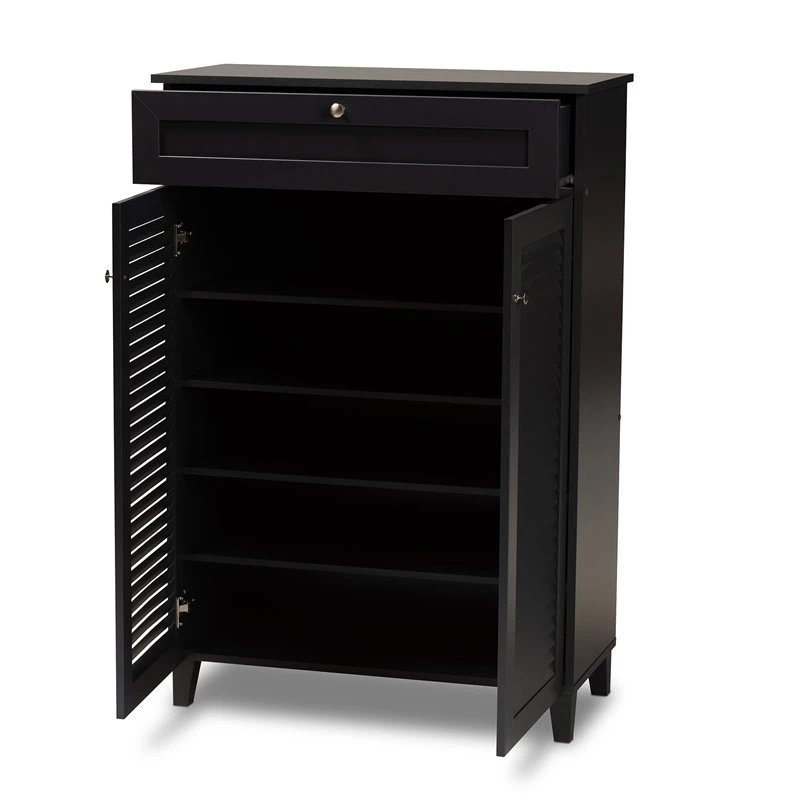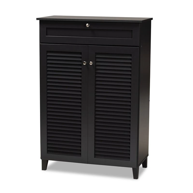Dark grey finish, Five (5) shelves provide storage space for 15 pairs of shoes, Silver metal door knobs, Assembly required, Tapered legs, One (1) drawer