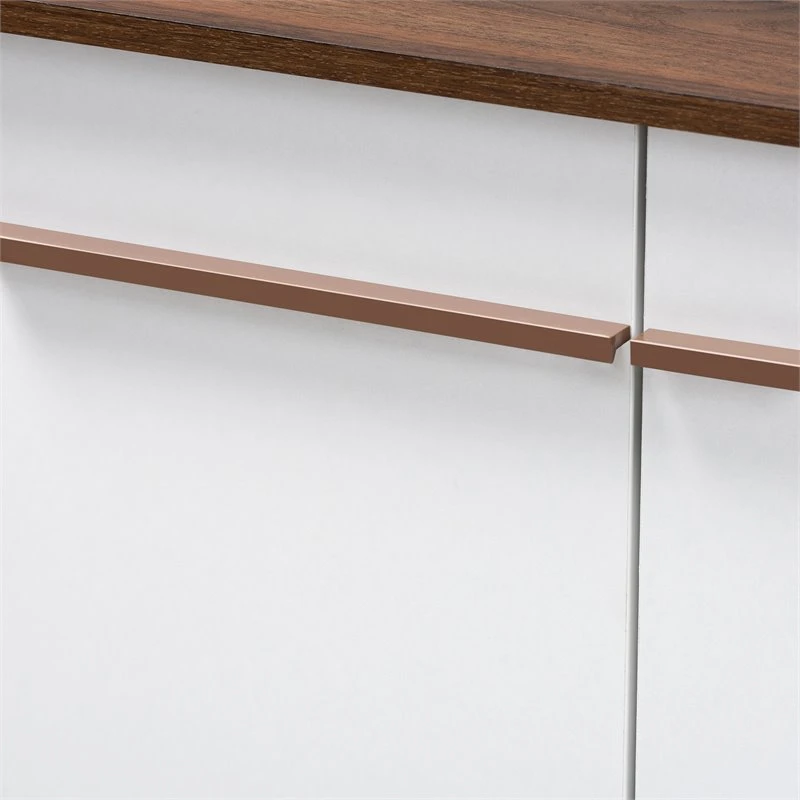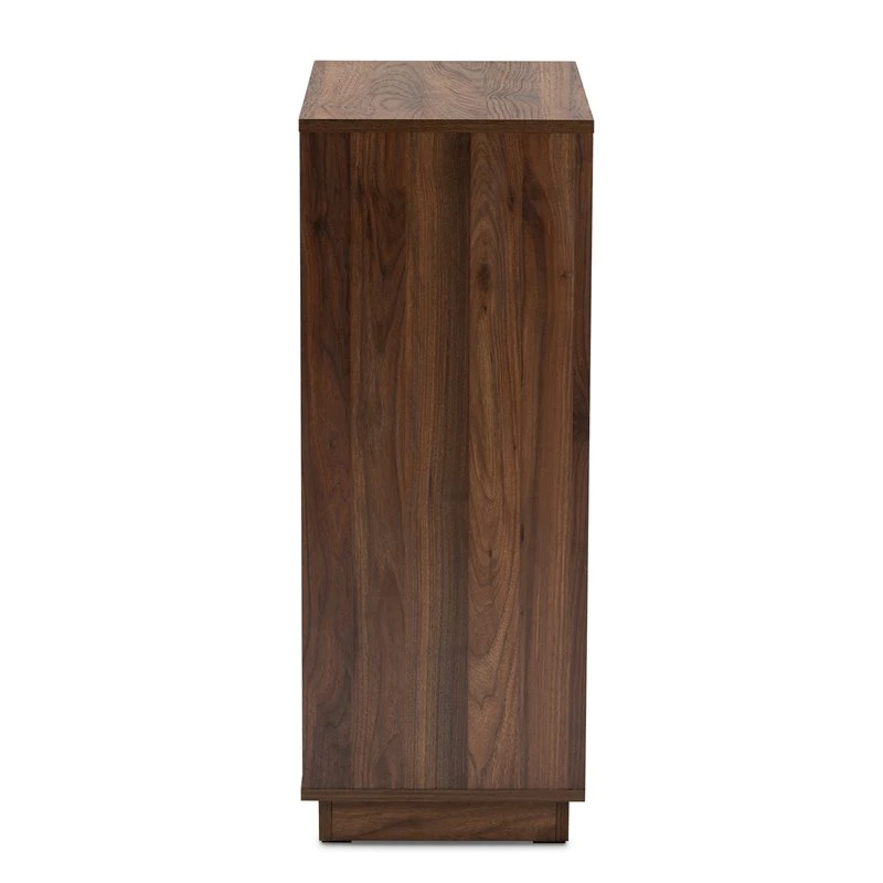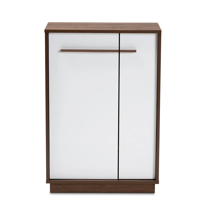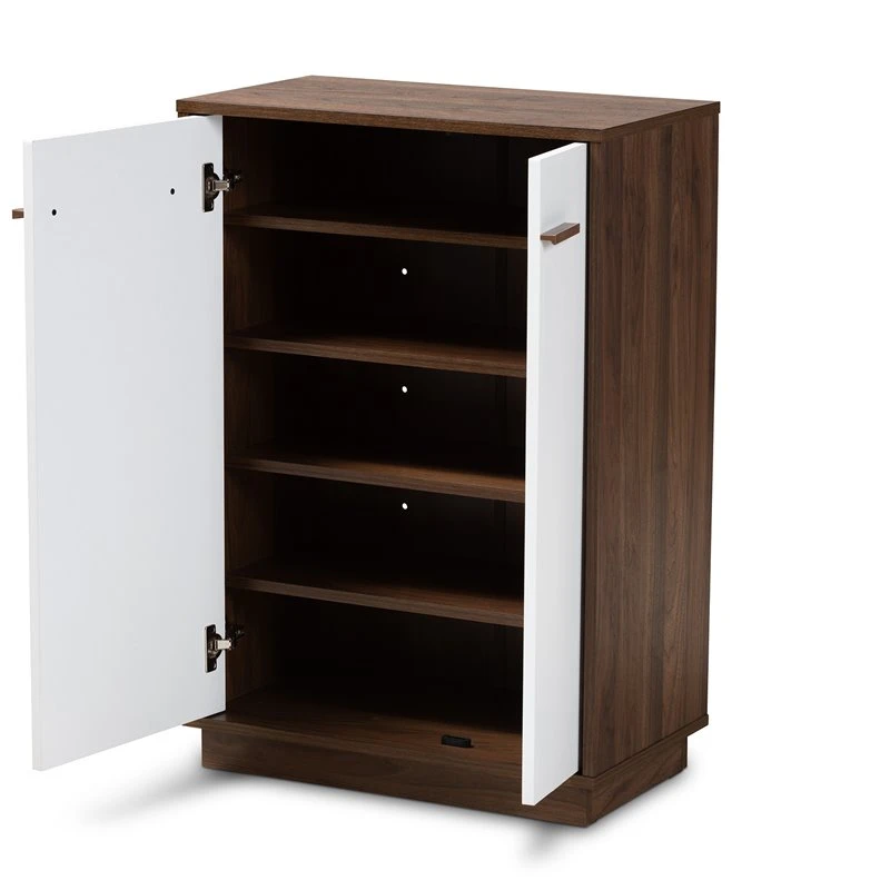 Constructed from engineered wood, Two-tone white and walnut brown finish, Five (5) shelves provide storage space for 15 pairs of shoes, Brown PVC plastic door handles, Made in Malaysia, Assembly required