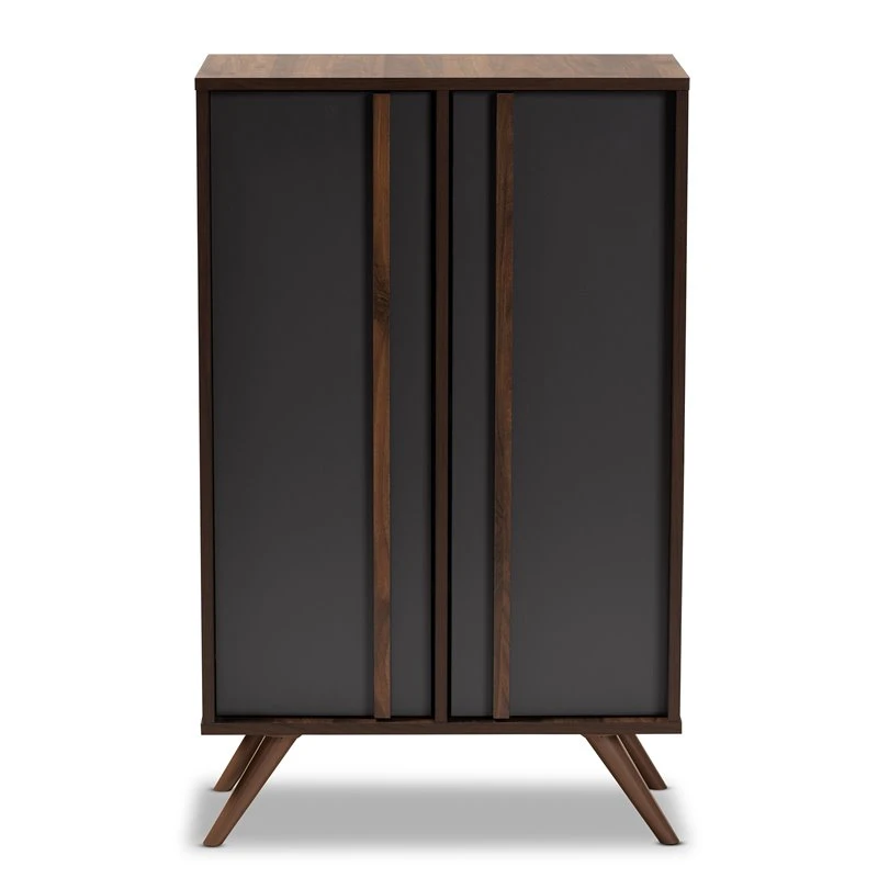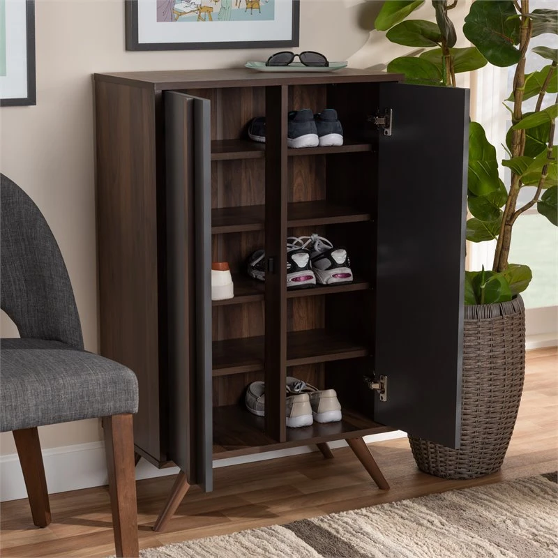 With an ultra-modern, two-tone finish and ample storage space, the Naoki shoe cabinet is sure to make an impression in any space. Made in Malaysia, this wooden cabinet features five shelves with space to store up to 15 pairs of shoes. Its two-tone grey and walnut brown finish are paired with long, vertical handles for a cool, contemporary look. Splayed legs add a retro touch. Requiring assembly, the Naoki is sure to keep your entryway looking chic and organized. Dimensions: 38.1″ high x 23.6″ wide x 13.4″ deep; Legs: 5.9″ high; Shelf: 22.3″ wide x 9.4″ deep x 5.7″ high;