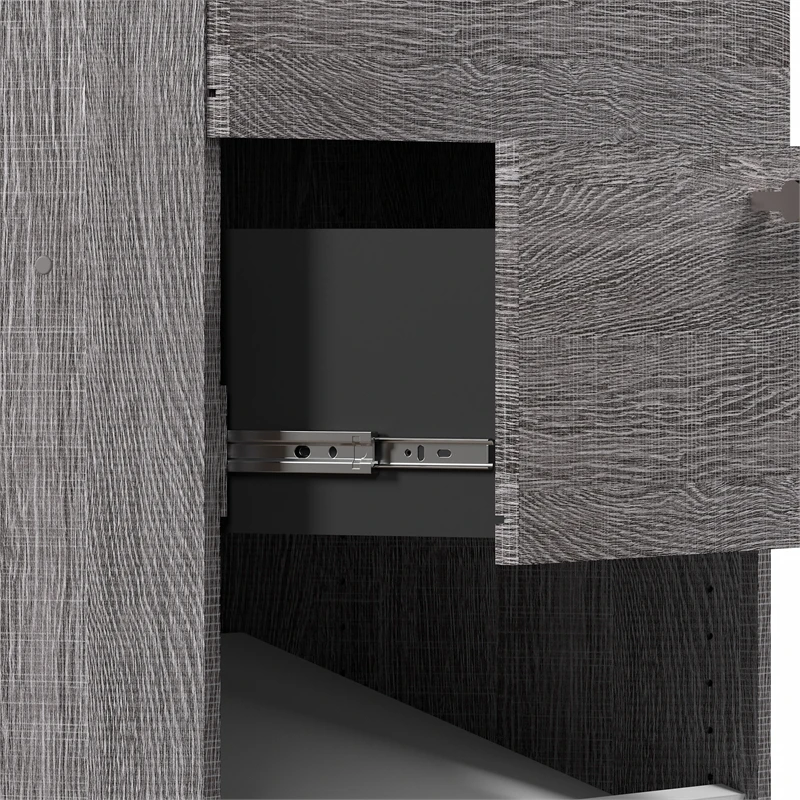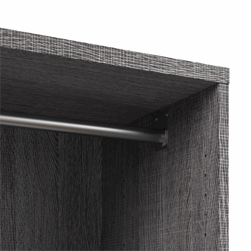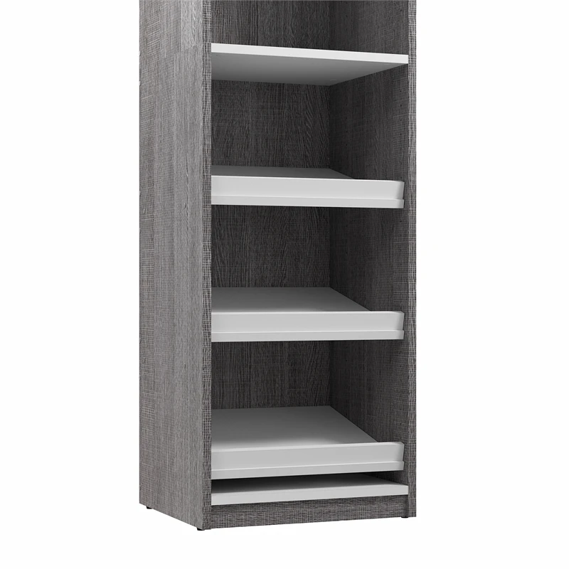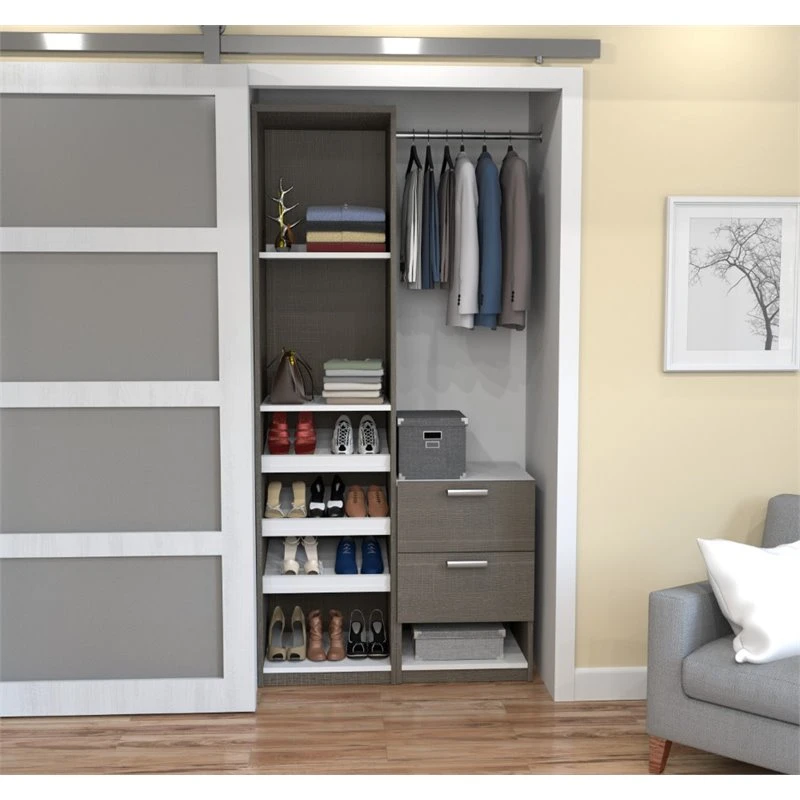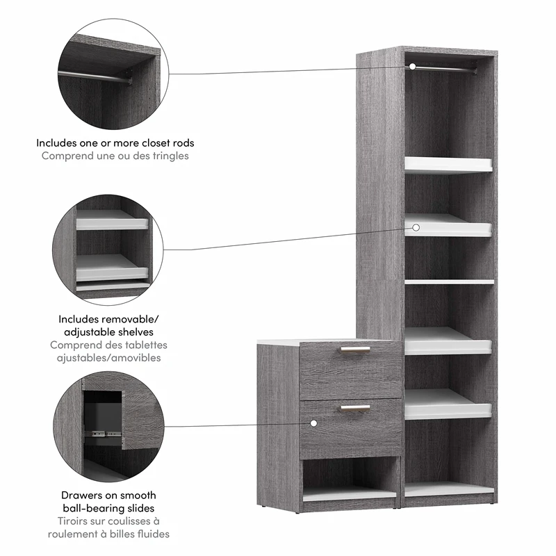 With the Bestar Cielo 40W Closet Organizer System, you can elevate your organization game and store your garments and accessories in an impeccable fashion that suits your taste. Get your home in order with one clothing rod, two fixed shelves, and four adjustable/removable slanted shelves made to help you organize clothing, bags, shoes, and other items of varying sizes. Use the additional drawers to store accessories and more. Drawers glide on smooth ball bearing slides for an easy reach to the back. Can be set up as a one multifunctional unit or as two separate storage solutions, a closet system and a nightstand. This closet organizer is backed by the Bestar 10 Year Manufacturer’s Warranty. North American made with globally sourced materials.
