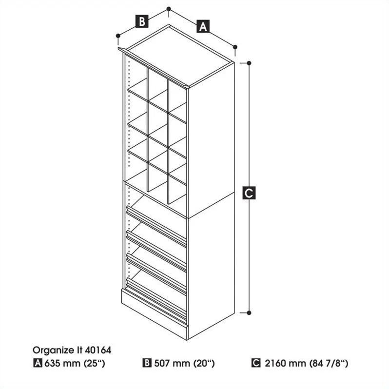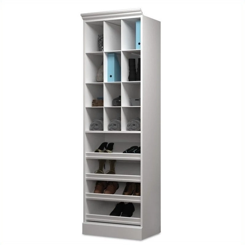 The Bestar Versatile 25W Closet Shoe Organizer is the perfect solution to keep your shoes and accessories organized with style. Thanks to its compact design, it fits easily into the room of your choice. Get your home in order with twelve cubbies for easy access to hats, bags, gloves, and more. Four spacious slanted shelves feature front lips to prevent items from sliding off, making them a great location for your large shoe collection, or even handbags. Designed for use as a standalone closet organizer or as part of a larger configuration when paired with coordinating items from the Versatile Collection (sold separately), this organizer provides ample opportunities for keeping your home in order without overwhelming your floor space. Backed by the Bestar 10 Year Manufacturer’s Warranty. North American made with globally sourced materials.
