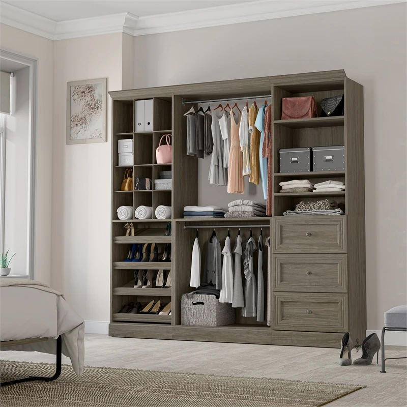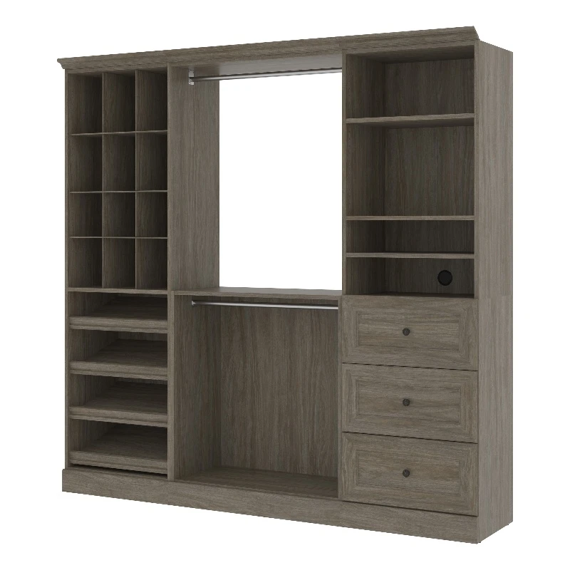 The Bestar Versatile 86W Closet Organization System allows you to organize your entire wardrobe with style. With a mix of open and concealed storage, you can display your favorite outfits and keep personal items out of sight, but easily accessible. The open shelving is perfect for storage baskets, decorative items, books, and other accessories. Thanks to the clothing rods, you can keep your favorite clothes wrinkle free. You can customize your storage options by moving the adjustable shelves to accommodate bags, and items of various sizes. The closet organizer system is perfect for a walk-in closet, but can also be used against a wall in your bedroom, guest room or even in the hallway or entryway. The pieces can also be used separately. This closet organizer is backed by the Bestar 10 Year Manufacturer’s Warranty. North American made with globally sourced materials.