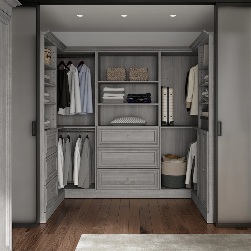 - The walk-in closet organizer features a mix of fixed and adjustable/removable shelves to customize your closet organization