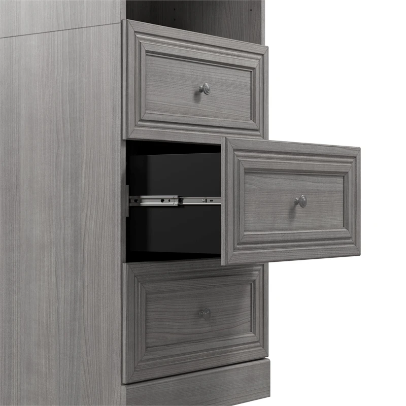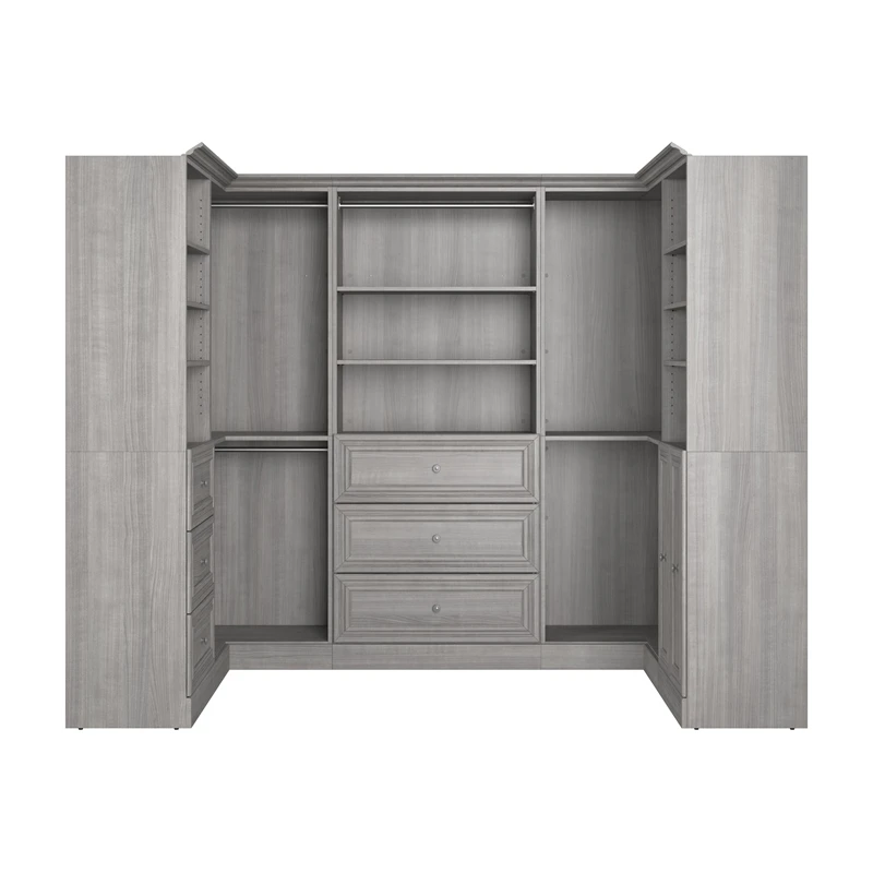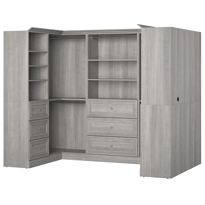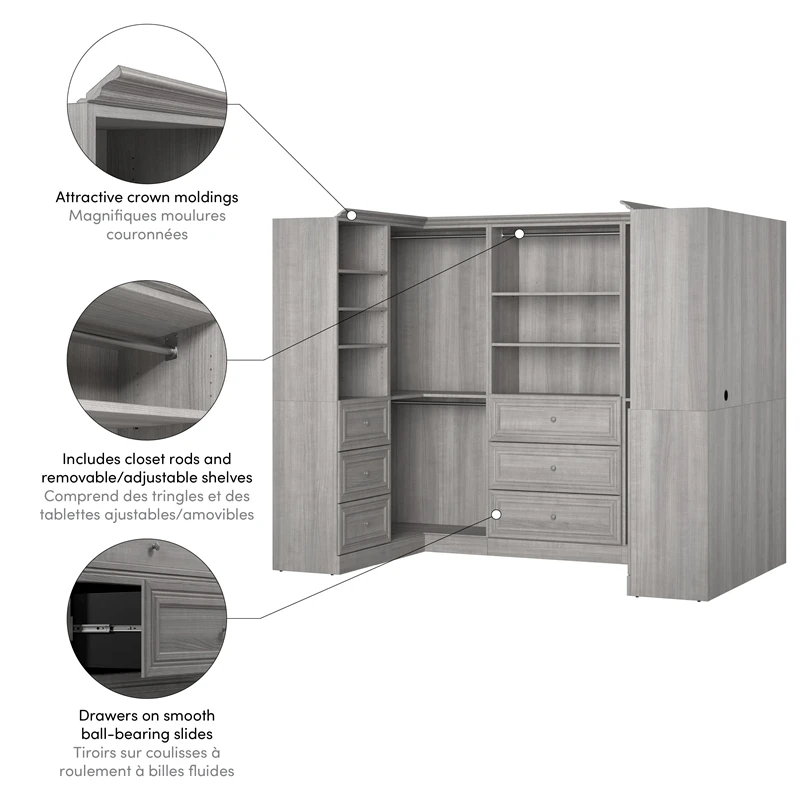 The Bestar Versatile 108W U-Shaped Walk-In Closet Organizer provides all the closet storage you need. With a mix of open and concealed storage, you can display your favorite outfits and store personal items out of sight. The stylish drawers, functional shelves, and practical clothing rods will help you organize all your clothes and accessories in no time. You can use the closet system as one piece, or use the shelving units separately according to your space and needs. The spacious drawers glide on smooth ball-bearing slides for an effortless reach to all of your belongings. Customize the storage options to create the walk-in closet of your dreams and move the shelves as you see fit to accommodate items of various sizes. This closet organizer with drawers is backed by the Bestar 10 year manufacturer’s warranty. North American made with globally sourced materials.