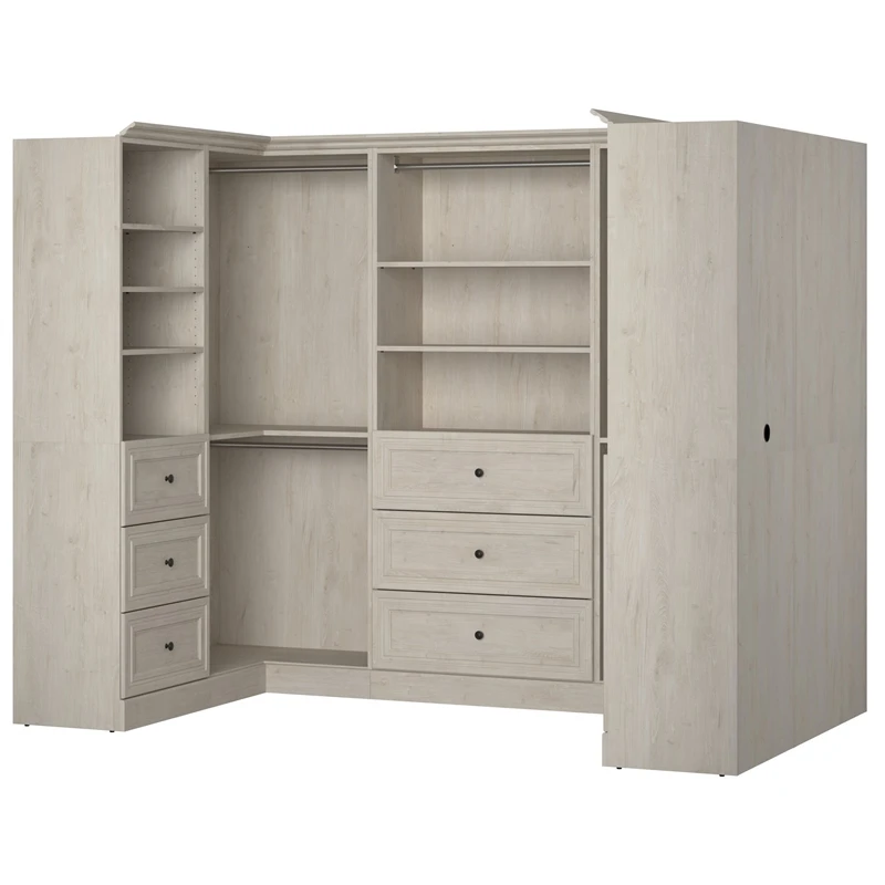 The Bestar Versatile 108W U-Shaped Walk-In Closet Organizer provides all the closet storage you need. With a mix of open and concealed storage, you can display your favorite outfits and store personal items out of sight. The stylish drawers, functional shelves, and practical clothing rods will help you organize all your clothes and accessories in no time. You can use the closet system as one piece, or use the shelving units separately according to your space and needs. The spacious drawers glide on smooth ball-bearing slides for an effortless reach to all of your belongings. Customize the storage options to create the walk-in closet of your dreams and move the shelves as you see fit to accommodate items of various sizes. This closet organizer with drawers is backed by the Bestar 10 year manufacturer’s warranty. North American made with globally sourced materials.