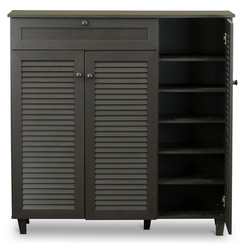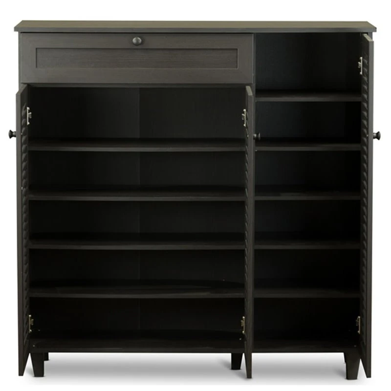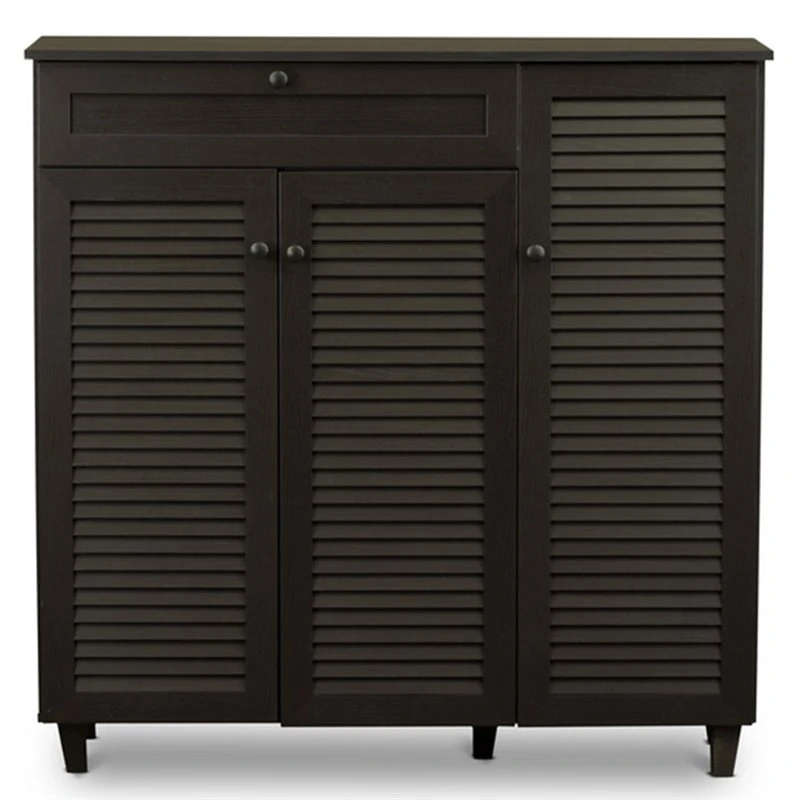 Storage and style. This Wood Shoe Storage Cabinet offers plenty of places to stow footwear without forsaking fashion. This contemporary shoe-storage cabinet can be placed just about anywhere in your home thanks to its dark-brown finish and attractive wood frame. Three hinged front doors feature solid wood handles.