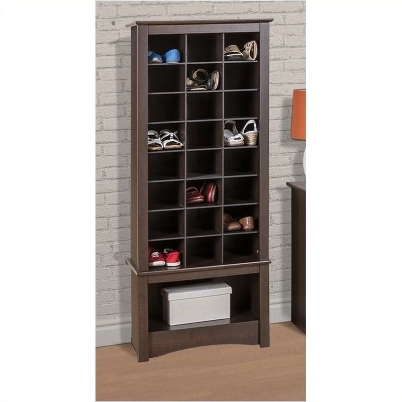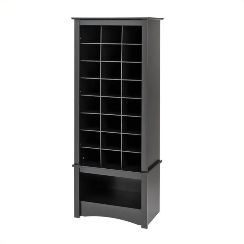 Don’t hide your favorite shoes at the back of the closet! Our stylish tall shoe storage cabinet is a perfect fit for any foyer, mudroom, entryway or bedroom. Get your shoes up off the floor and neatly organized with the functionality of custom built-in shelving at an affordable price. This cabinet has 24 spacious cubbies that can fit men’s size 13 shoes and a large bottom compartment for boots, bags or even a basket to hold accessories such as scarves or gloves. Built with durable laminated composite woods and finished in “hide-the-scuffs” Black or Espresso.