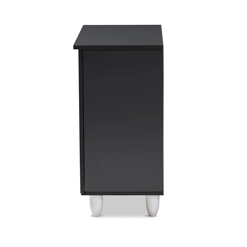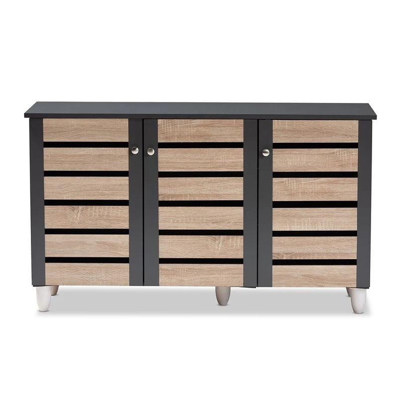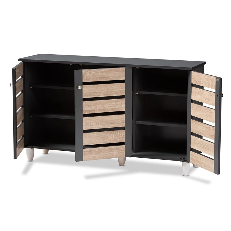 With a compact and elegant design, the Bowery Hill shoe cabinet is perfect for houses with space constraints. Constructed from solid particle board, the cabinet features a two-tone oak and dark grey finish that is easy to coordinate with a wide range of decor styles. Two doors conceal two shelves with storage space for up to nine pairs of shoes. The doors feature open slats to enable air circulation and prevents moisture on your shoes. White PVC legs provide elevation for easy dusting. The shoe cabinet is made in Malaysia and requires assembly.