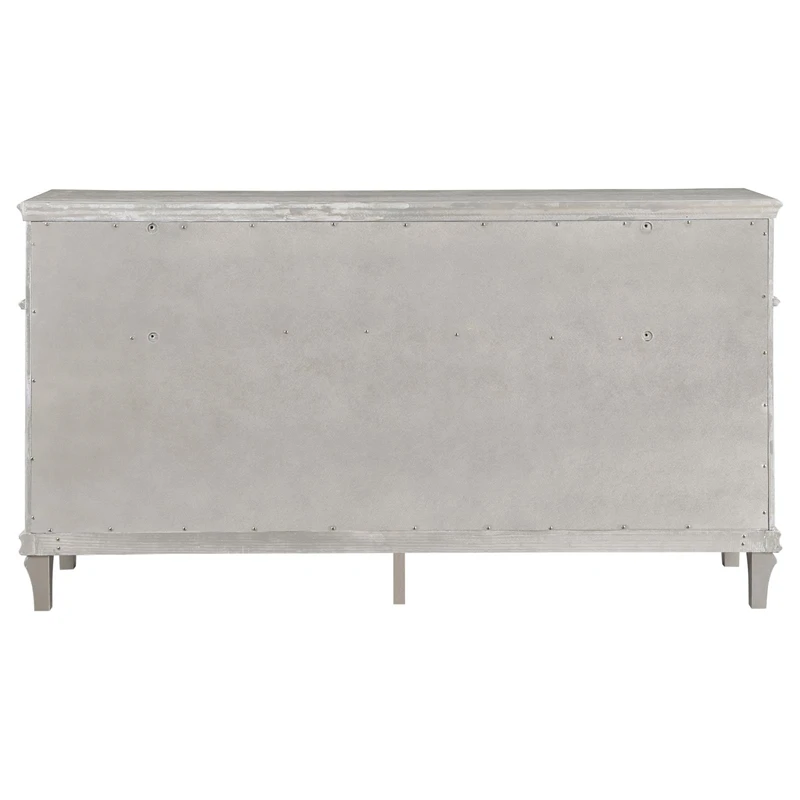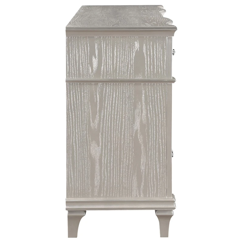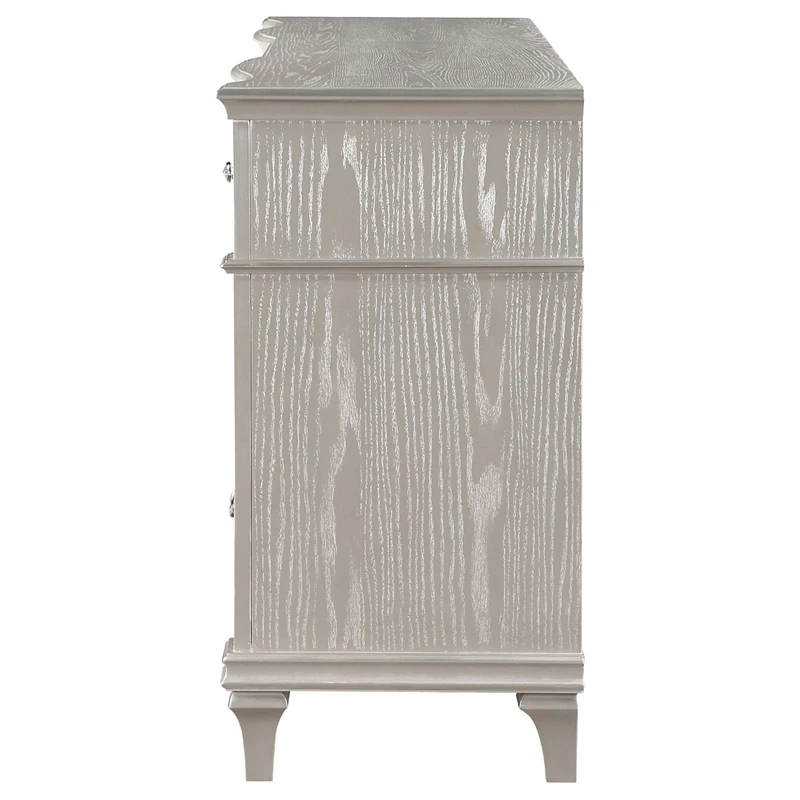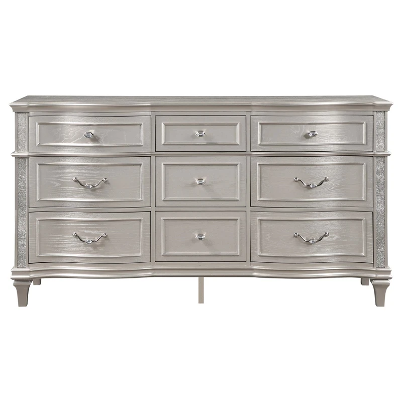 A silver oak finish creates an elegant touch to this glam nine-drawer dresser. Hexagon-shaped knobs and drop bail handles appointed with pearl accents adorn each of the nine spacious drawers for a luxurious look and feel. Keep delicate essentials organized within the gray felt-lined top drawers and garments in the deep bottom drawers. Across the dresser front is a curved facade that sweeps through the drawer fronts and ends at two sparkling column panels. Charming wood molding details along the top and bottom, along with intricate trim, offer a classical flair.