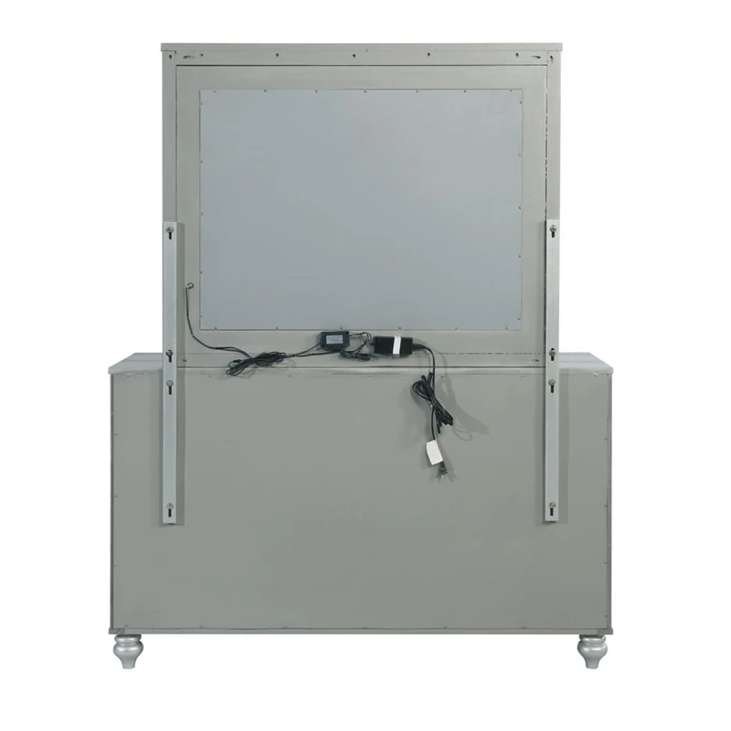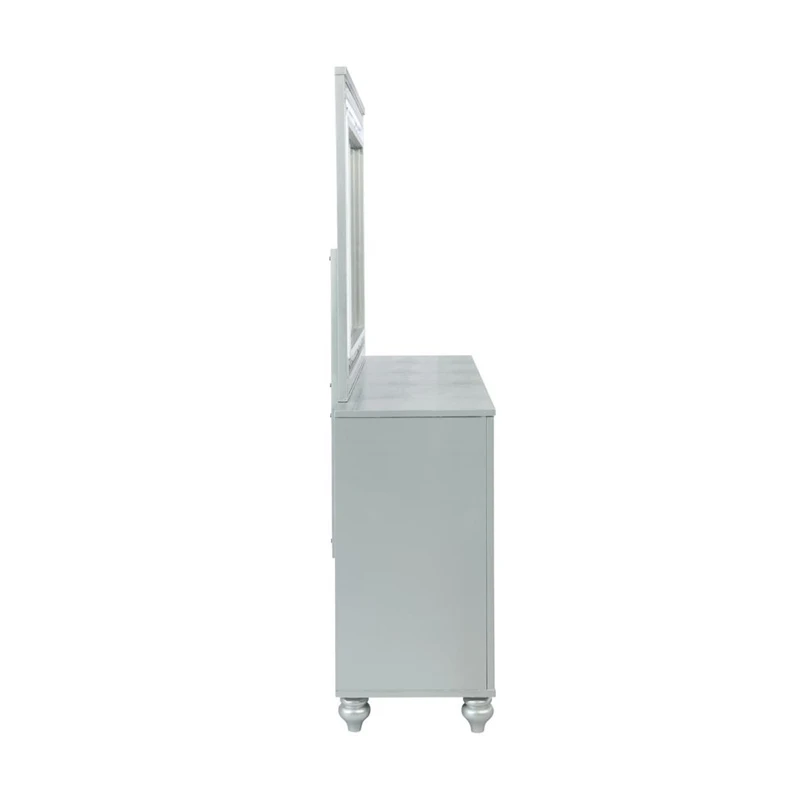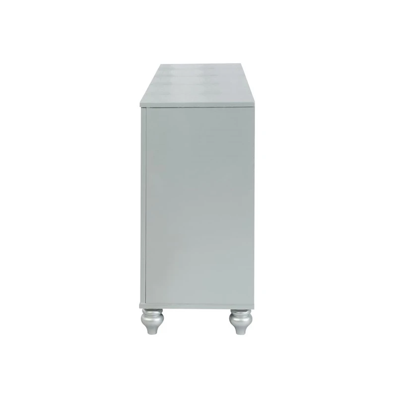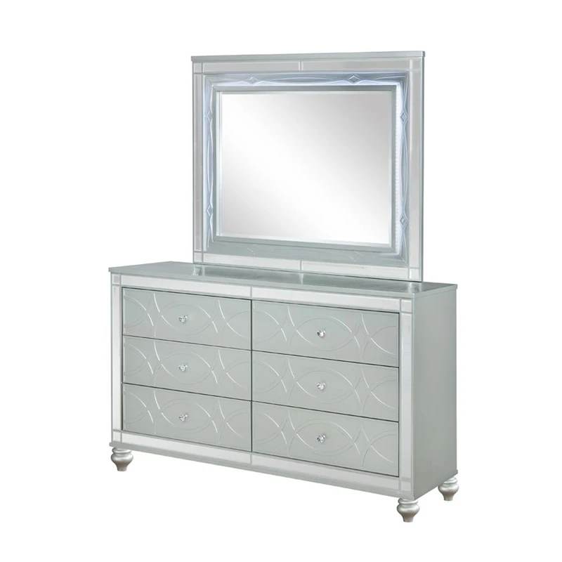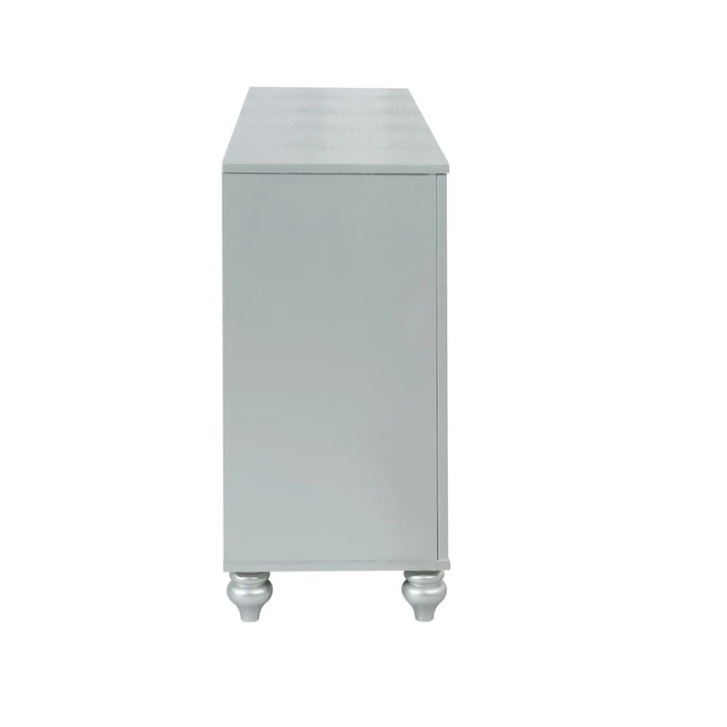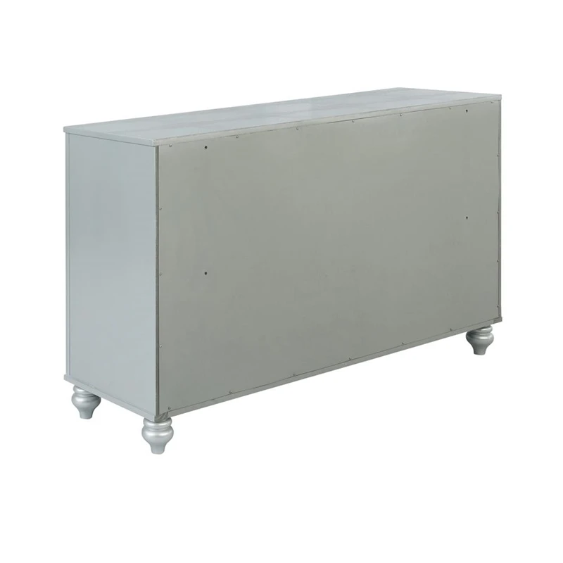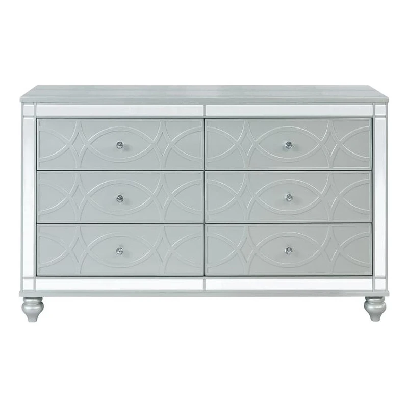 Give your home a modern glam update to classic design with this transitional six-drawer dresser. It features a glitzy design that takes center stage in any modern bedroom. It’s fashioned with a vibrant silver metallic finish with fret work detail on the front panels and drawer fronts. The drawers are adorned with crystal-like pulls and the top ones are lined with black felt. Delicate bun feet complete the design of this exquisite showpiece dresser.