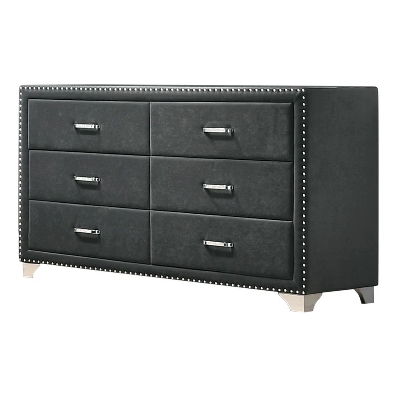 Give outdated sleeping spaces a facelift with this eye-popping and elegant dresser. Entirely upholstered in velvet, this dresser is a conversation starter. It is equipped with six spacious drawers to store your bedside items. Nail head trim makes a spectacular statement that matches the tapered legs. With its stunning and regal design, this dresser will transform your sleeping space into a royal retreat.