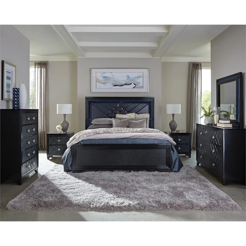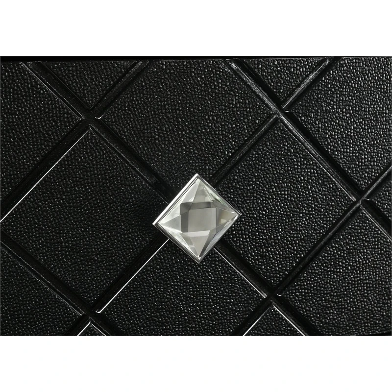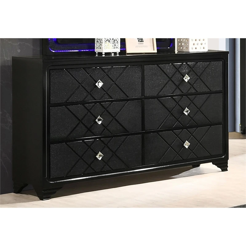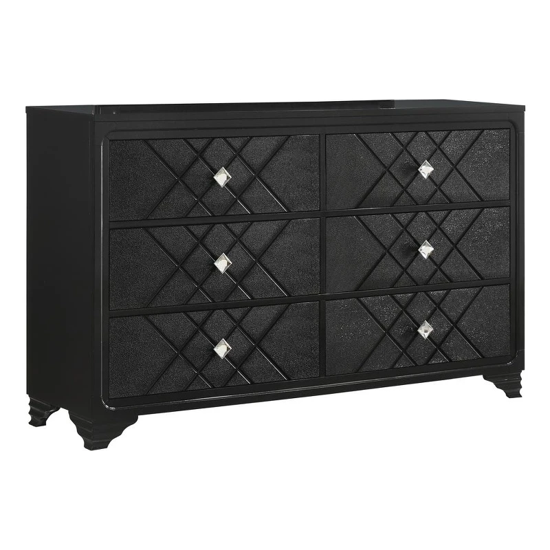 Glitz and glam will overtake your sleeping space with this incredible black dresser. Six drawers display embossed panels with a geometric pattern. The diamond-style acrylic hardware makes for an incredible and elegant upgrade for this contemporary piece. A spacious tabletop brings plenty of space to display decorative items and bedside essentials. Enjoy years of durability and beauty from this piece, crafted from quality Asian hardwood.