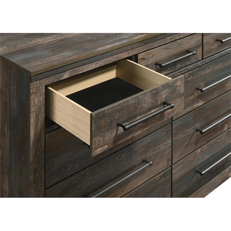 Cozy with a hint of cabin-esque flair, this nine-drawer dresser is ready to organize your sleeping space. Its rustic style is enhanced with a weathered brown finish that adds warmth and aesthetic allure. Extra-long bar pulls, finished in dark bronze, create a sleek and stunning detail. Keep jewelry and delicate items safe within the felt-lined top drawer. This durable piece is made from 3D paper veneer.