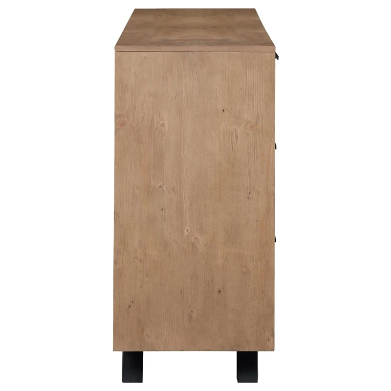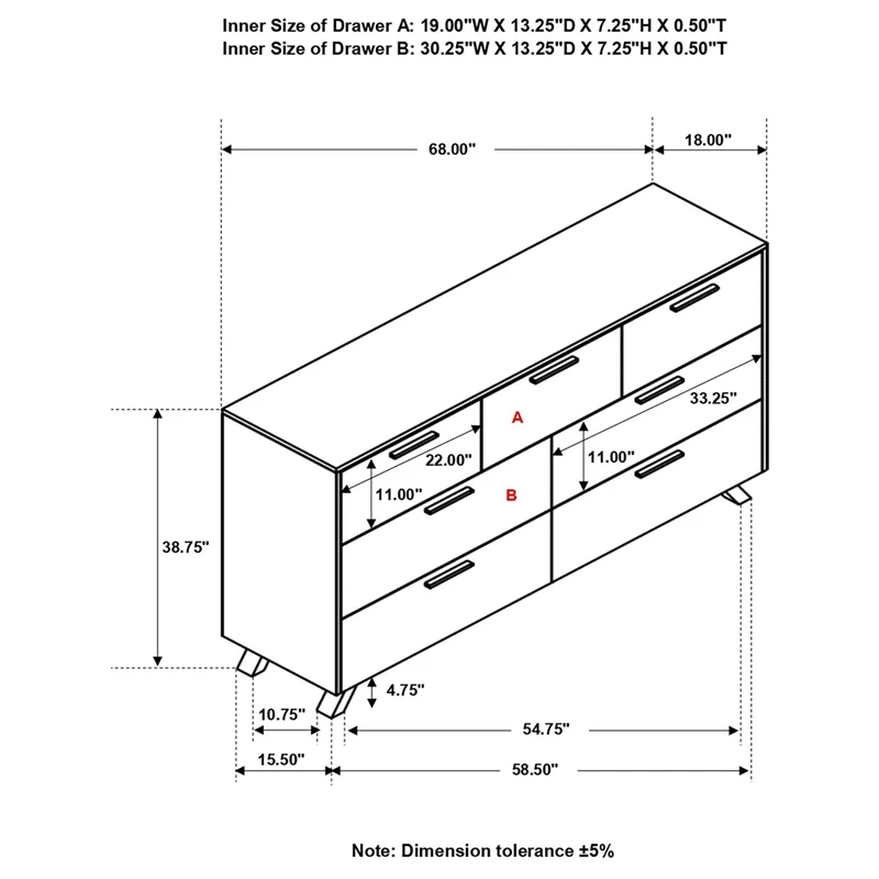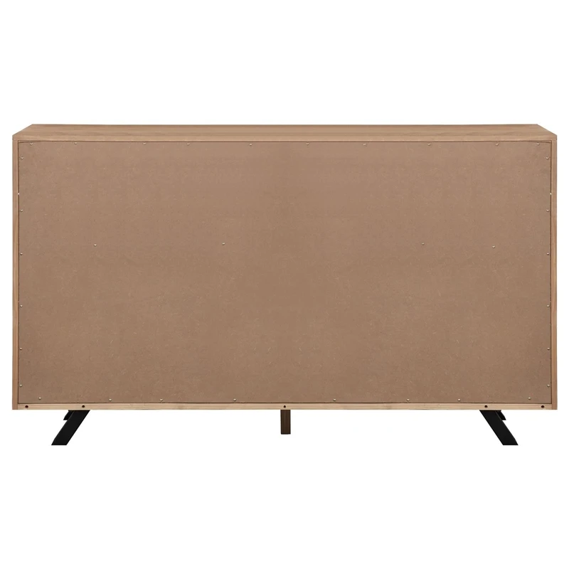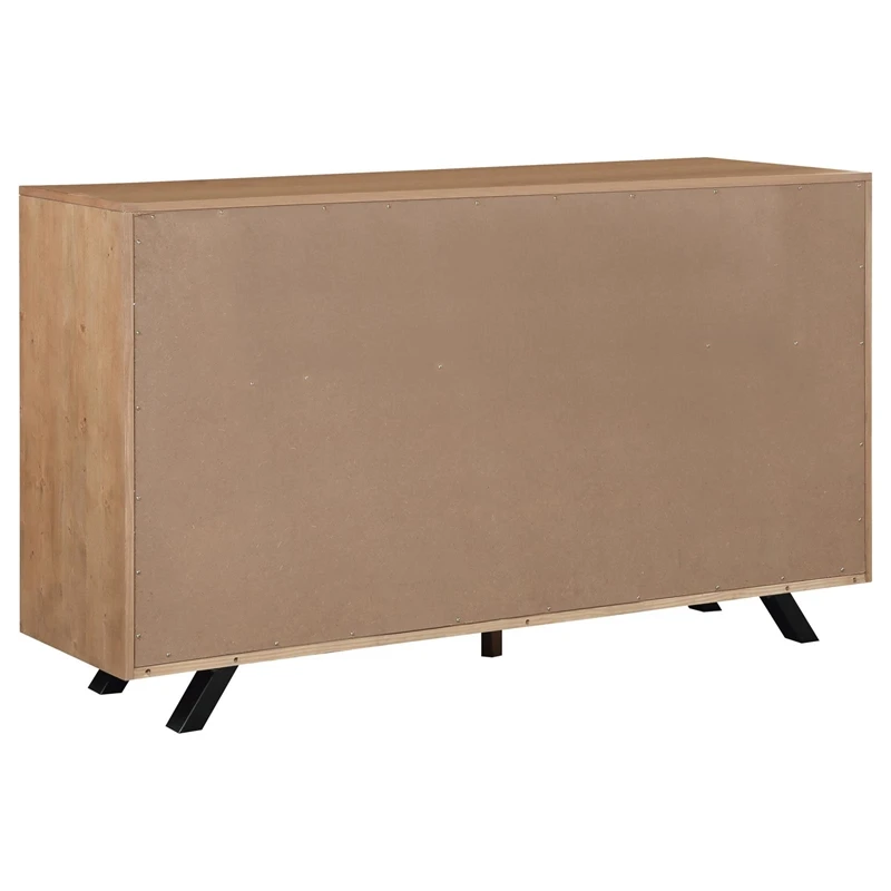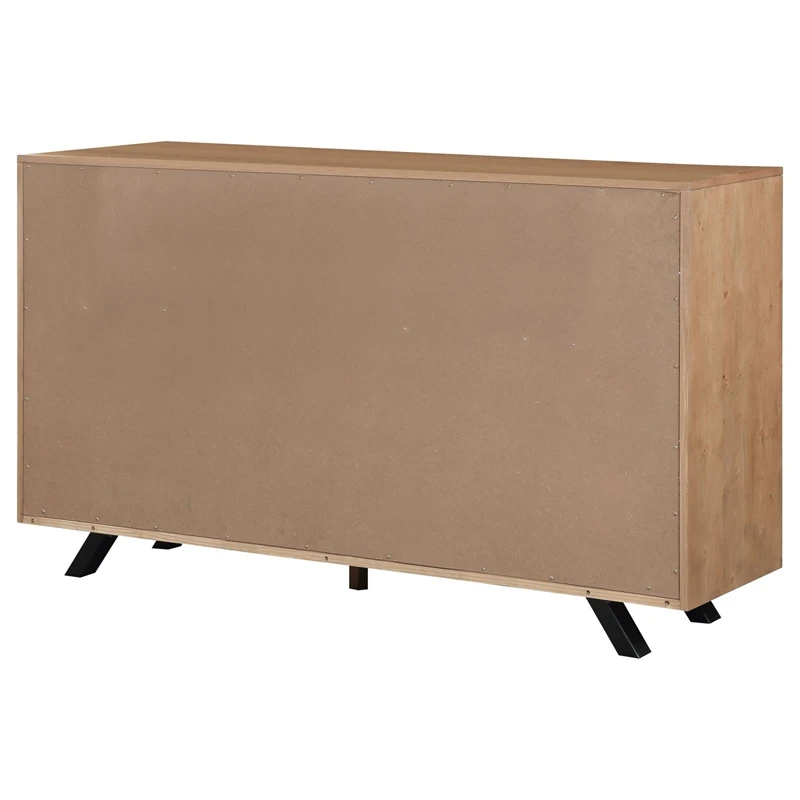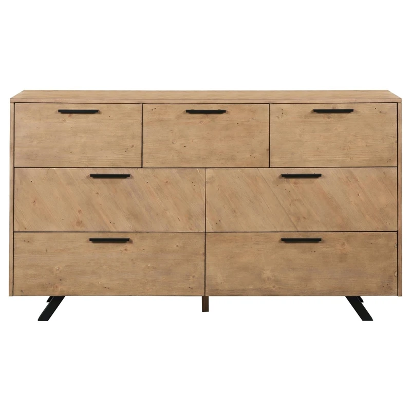 Create a spacious dressing area in your bedroom with this contemporary, seven-drawer dresser, designed with a light honey brown finished frame that rests on angled matte gunmetal finished legs. Soft felt-lined top drawers and cedar bottom drawers invite you to store all your linens and garments safely and securely.