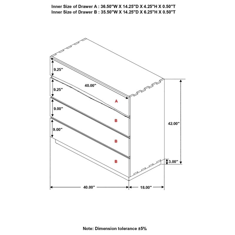 - Drawer box construction style: 5 pieces