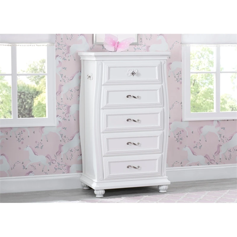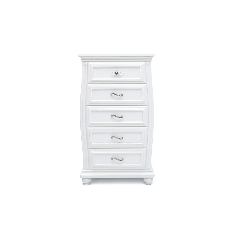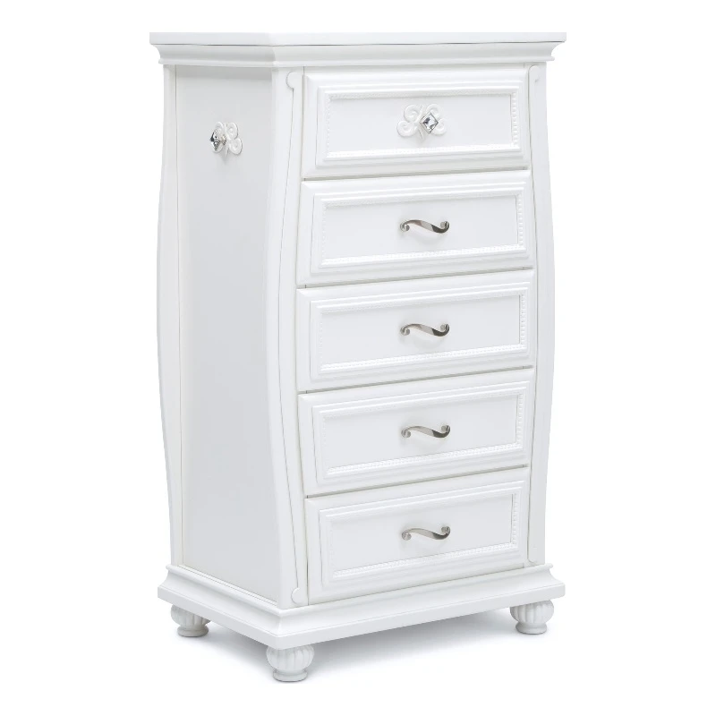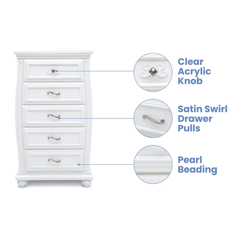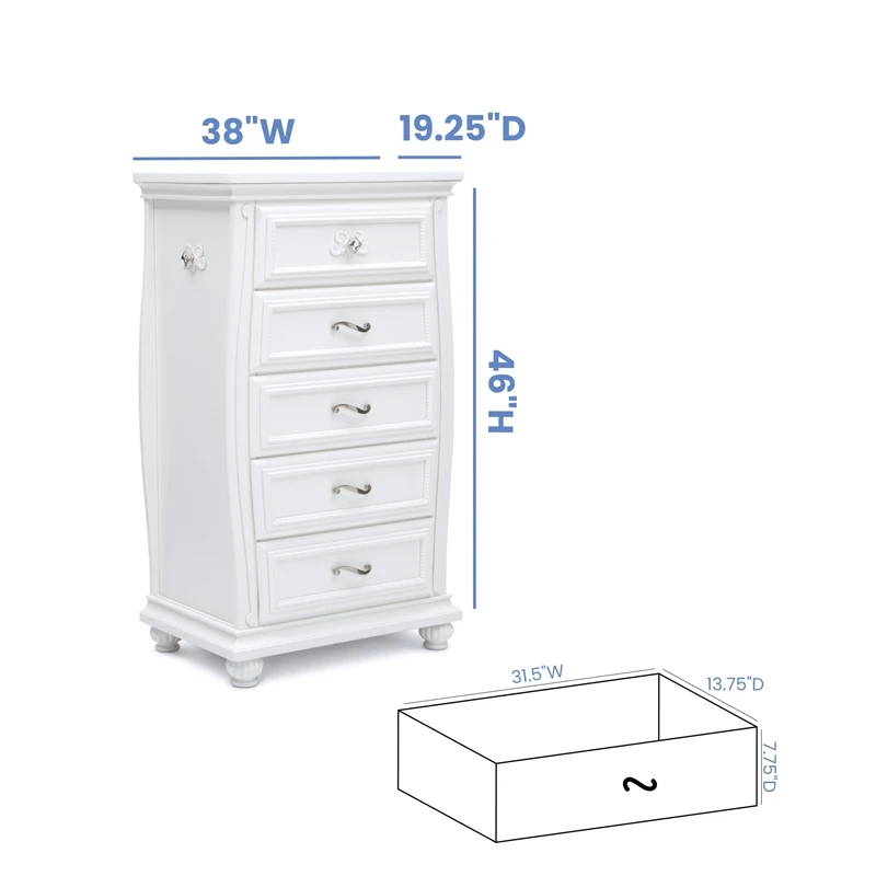 The Fairytale 5-Drawer Chest by Simmons Kids will be the crown jewel of any bedroom. Its exaggerated silhouette features curves inspired by the classic bomber shape for a whimsical touch while intricate carvings and bun feet balance the look. Five sliding drawers with swirl-shaped satin nickel pulls open to reveal a wealth of storage within. Acrylic knobs on each side of the chest provide additional storage space to hang accessories, like necklaces or headbands. To complete your bedroom or nursery, pair the Fairytale 5-Drawer Chest with coordinating items from the Simmons Kids Fairytale Collection. All Simmons Kids dressers meet the requirements of ASTM F2057, the voluntary industry tip over standard for dressers. For your children’s safety, only purchase dressers that comply with this standard. For additional security, Simmons Kids strongly recommends that all dressers in your home be anchored; all Simmons Kids dressers include a wall anchor. To learn how to properly secure your dresser, please see the product assembly instructions or visit our website. Pair this Chest with the Fairytale 5-in-1 Convertible Crib #W340790 and Fairytale 7 Drawer Dresser #W340070 to complete your nursery