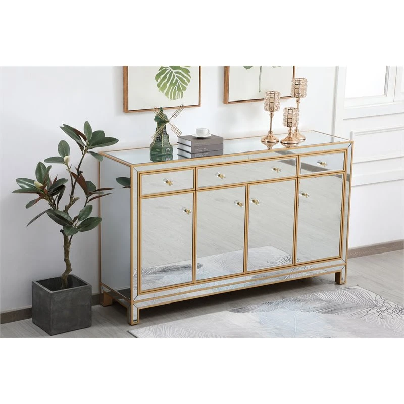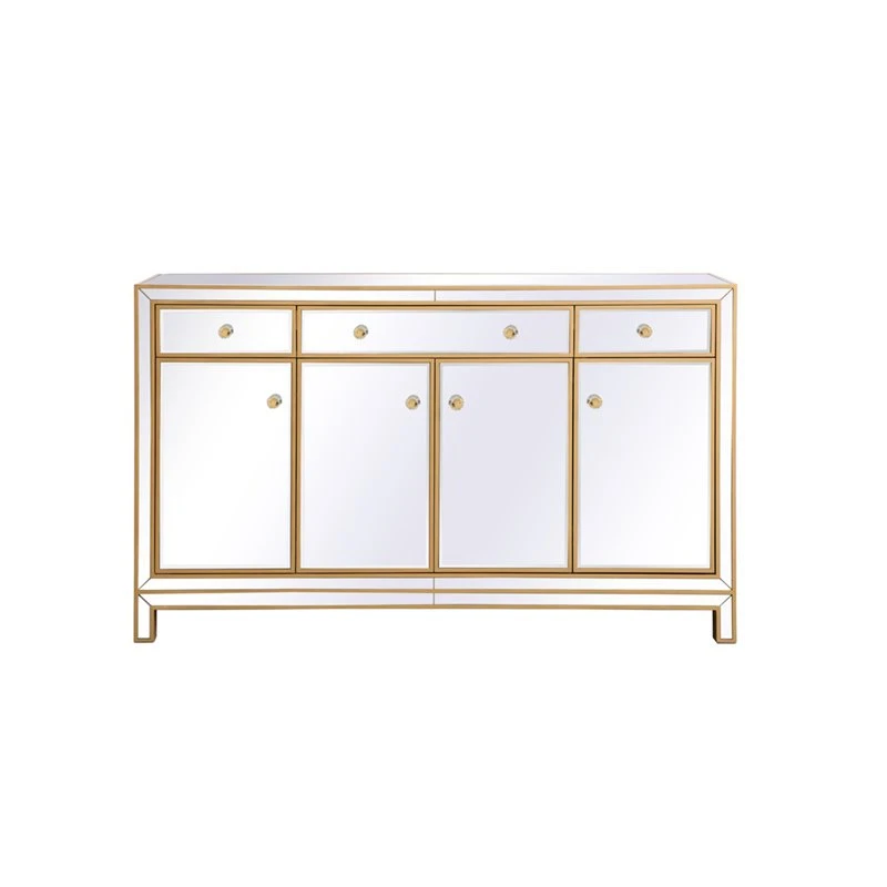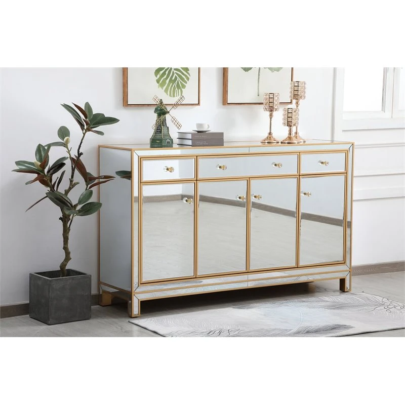 Bring plenty of storage space and modern style to your living room, dining room or entryway with this mirrored credenza. This was made to withstand everyday use. Deep drawers to hold up to 66 pounds and opens quietly. Four doors open to reveal one shelf in each cabinet for barware, fine china, and table linens. This versatile credenza blends in easily with any décor and easy to maintain. Ships fully assembled and ready to use. With anti-tip straps included for added security, this modern addition will complete your room.