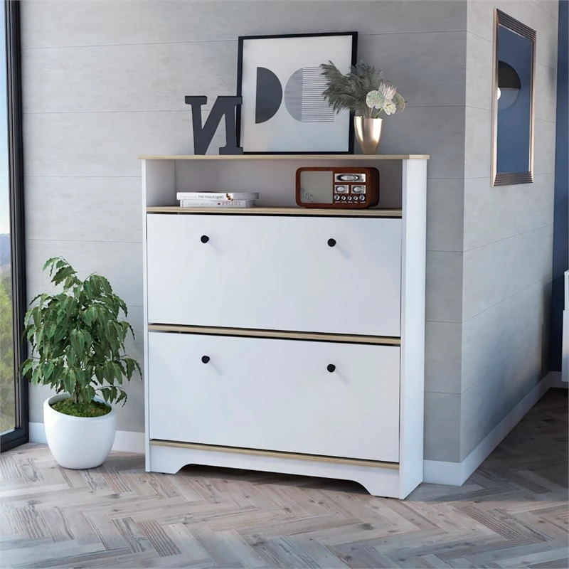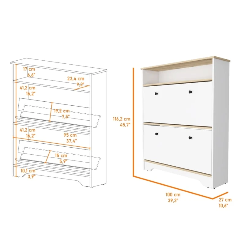 Is your shoe collection taking over your room? The Brandford Shoe Rack is the perfect solution to your shoe storage woes. This innovative rack features a unique design that will take up minimal space in your room while neatly organizing all of your shoes. Whether you’re looking for a way to organize your running shoes, dress shoes, or sandals, this rack has got you covered. Plus, the stylish light oak-white particleboard finish will complement any décor. With two ample flexible shelves to hold up 12 pairs, one shelf and ample countertop. Order yours today and say goodbye to cluttered closets! Ergonomic and unique dimensions