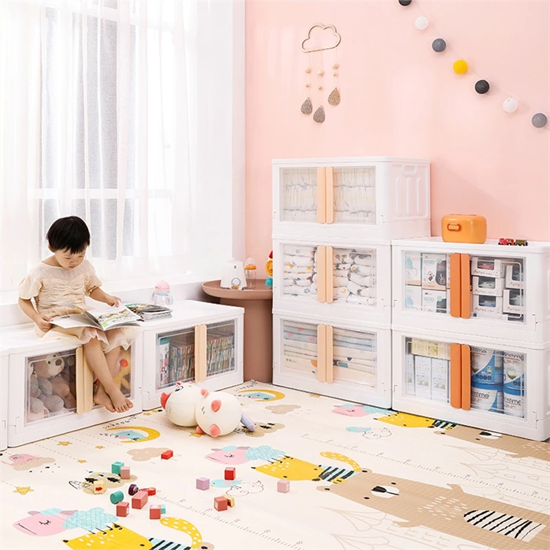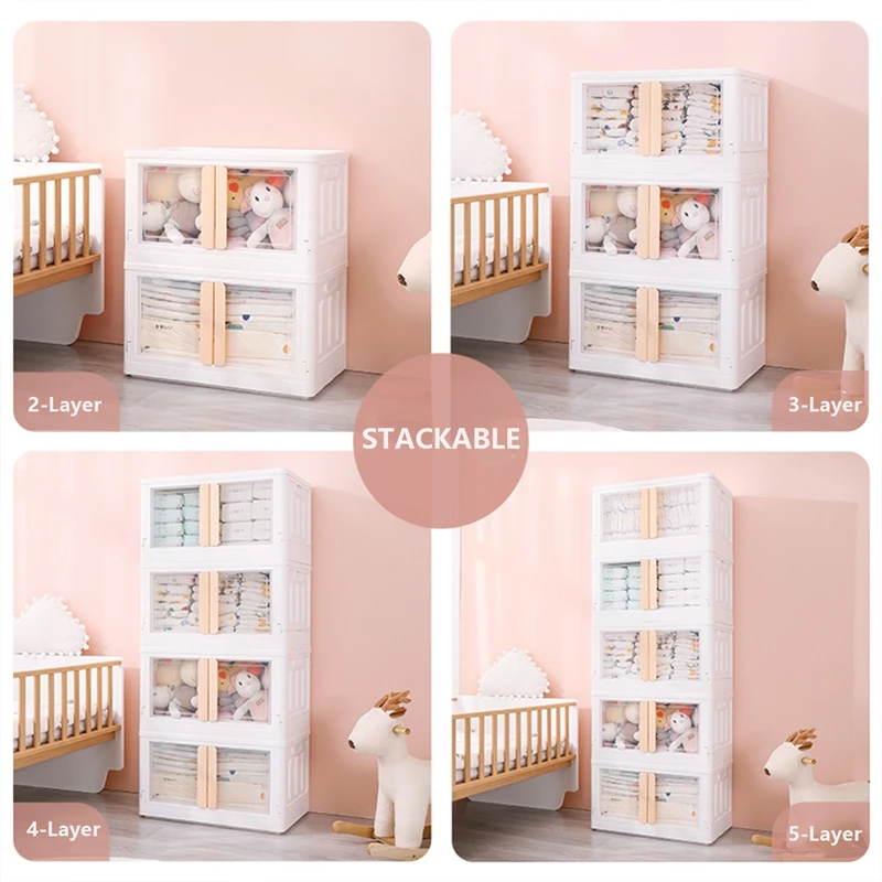 Our foldable and stackable storage container with visible doors is made of PP material. Easy assemble with the folding design. It features stackable with grooves on the top which stack securely for easy moving, and save spacing in your house, apartment, and condo.