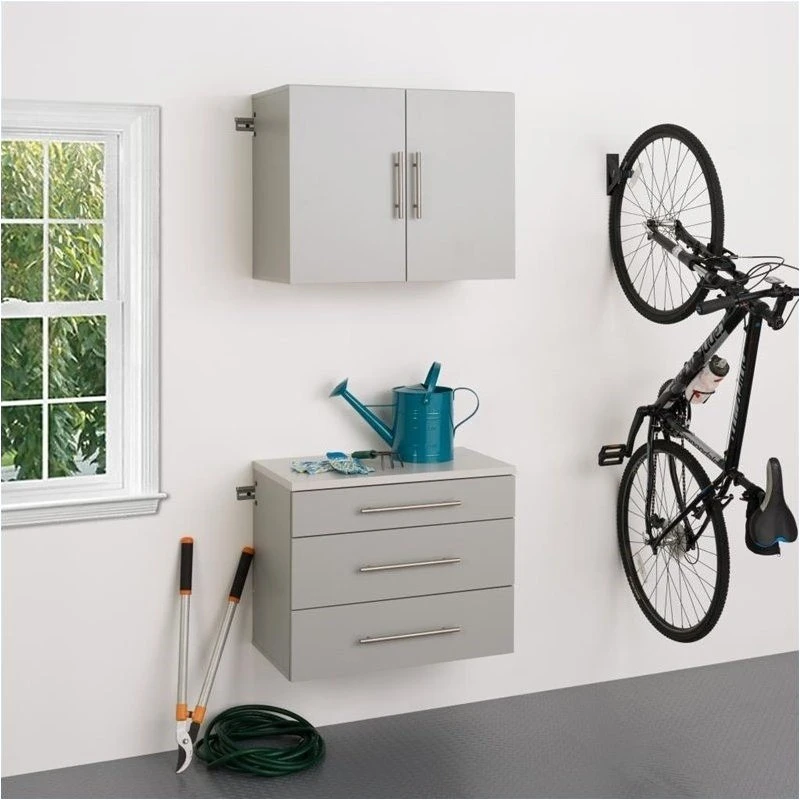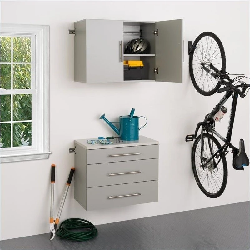 This piece offers versatility for your ever changing storage needs in the garage, laundry room, office or workshop. The Cabinets mount securely to the wall with a heavy duty metal rail and hook system. The wall mounted feature ensures easy cleaning beneath the cabinets and protects your stored items from water & dirt. The piece is constructed using industrial grade laminated composite wood and features metal handles and adjustable hinges.