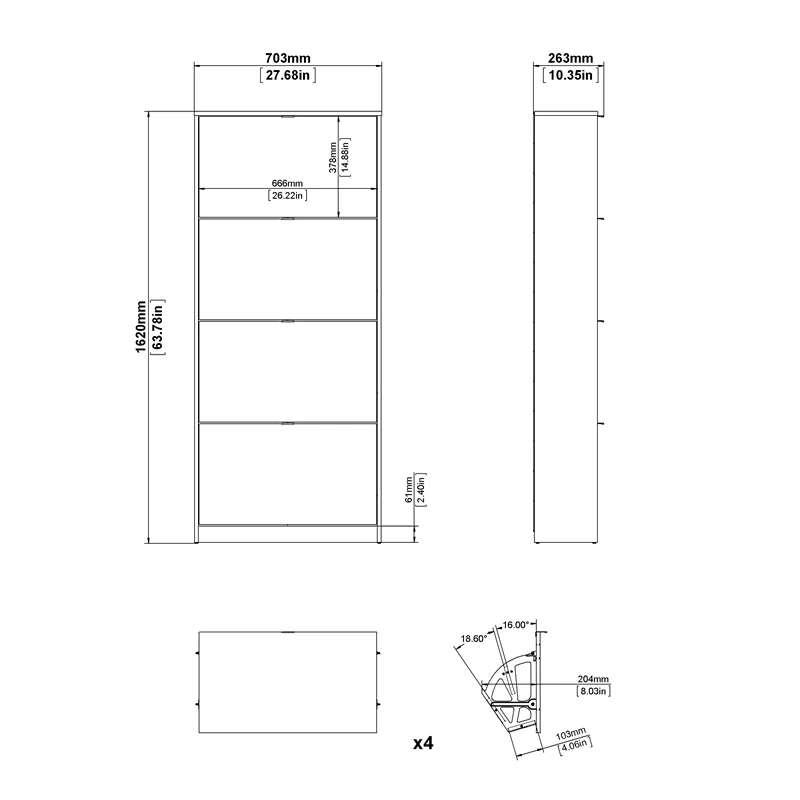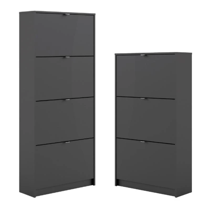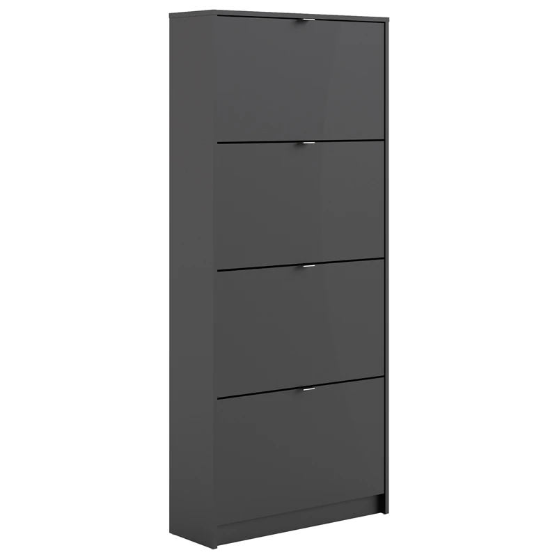 Organize all your footwear in one place and create a clutter-free space with the 4 Drawer Shoe Cabinet. With room for two rows of shoes in each compartment, the 4 Drawer Shoe Cabinet will protect about 24 pairs of your footwear, keeping them looking new! The tilting drawers ensures quick and easy access to your shoes when rushing out the door. Featuring a foil surface, this Scandinavian design is easy to clean and less susceptible to scoring, providing a durable and functional storage piece that looks anything but utilitarian. Combine with other pieces from the collection to build a shoe cabinet unit.