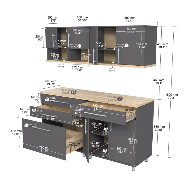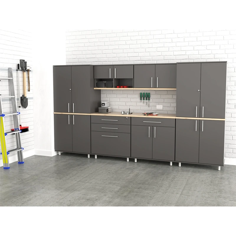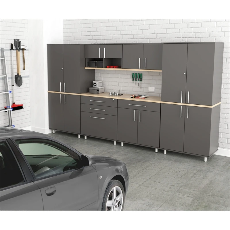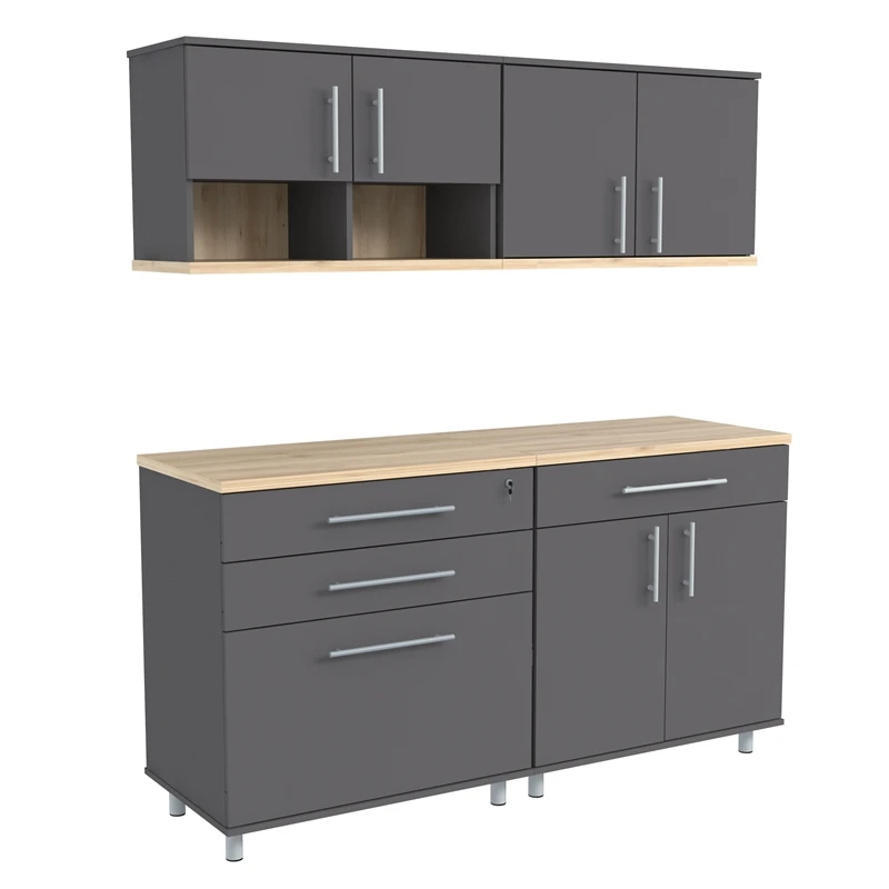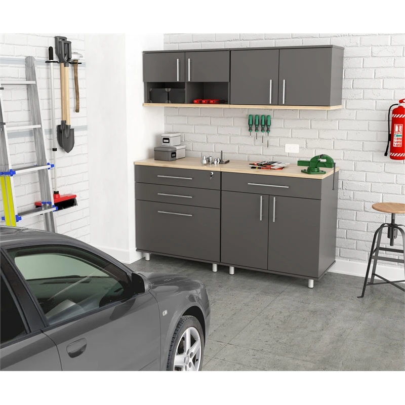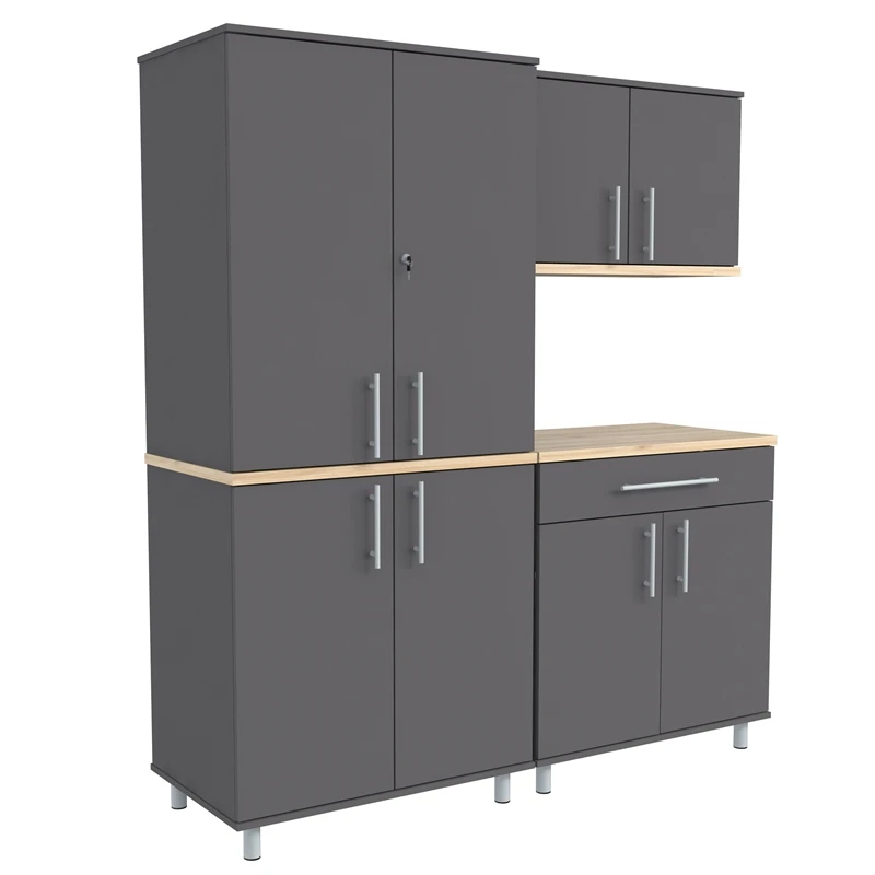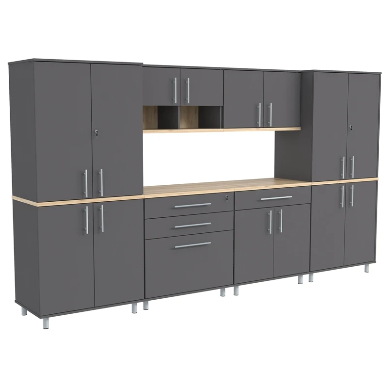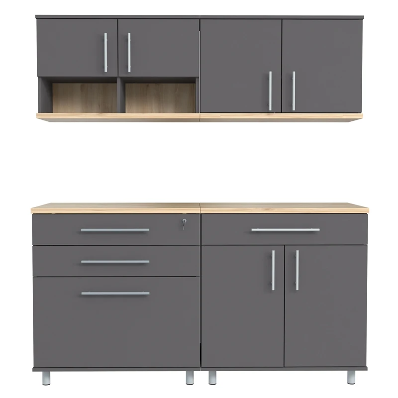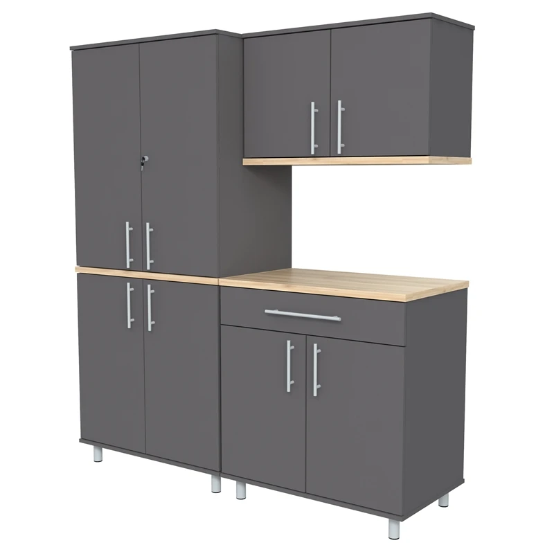 The Kratos Series Six (6) Piece Garage Storage Cabinet by Inval is finished in rich Dark Gray and Maple laminates. This unit includes two (2) large four (4) door storage cabinets (2 doors feature locking mechanisms for added security), a two (2) door (2) open cubicle wall mounted cabinet, a two (2) door wall mounted cabinet, a three (3) drawer storage and workspace cabinet (top drawer is equipped with a locking mechanism for added security) and a cabinet with a large work surface which includes a large drawer and two (2) doors. The unit is conveniently equipped with adjustable, easy to level feet. All doors are mounted with European style concealed hinges. Doors and drawers are embellished with large brushed metal handles. Tip-over restraint device Included. Wall mounting hardware is also included for wall mounted cabinets. Constructed from manufactured wood laminated on both sides with durable melamine which is stain, heat and scratch resistant. Assembly is required.