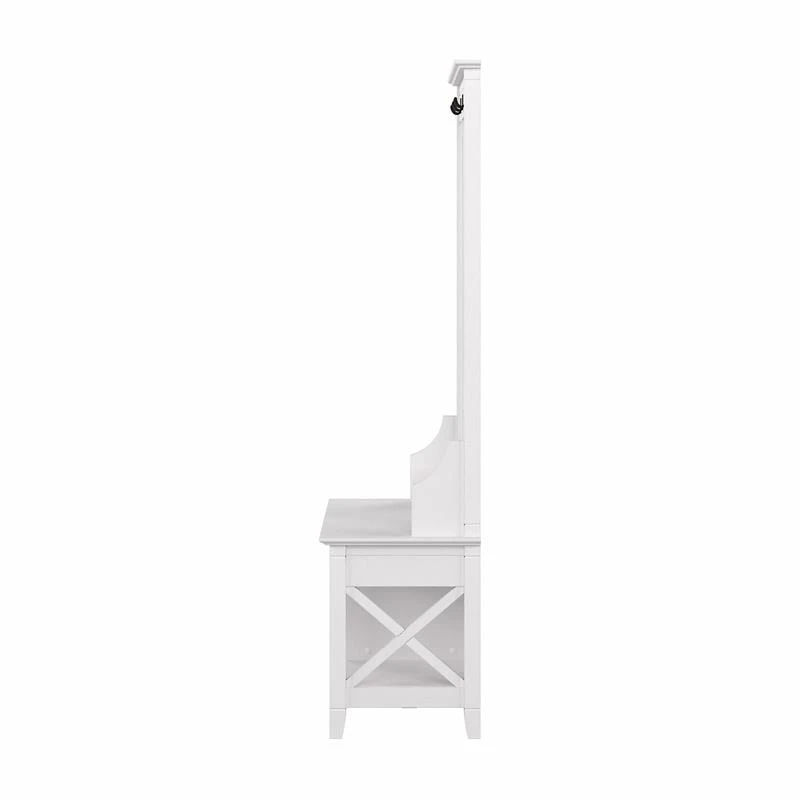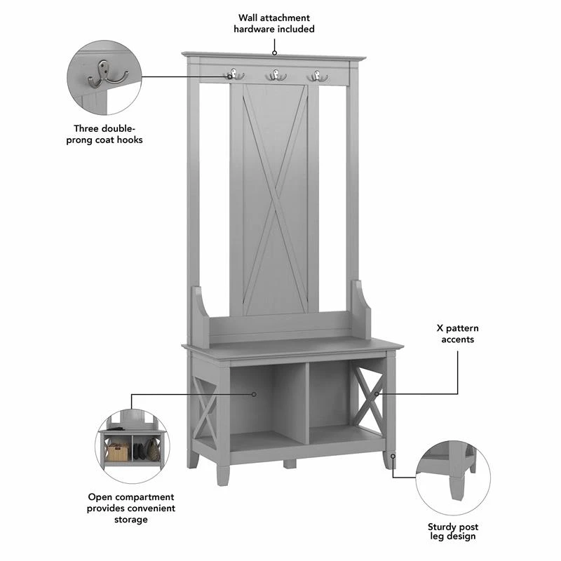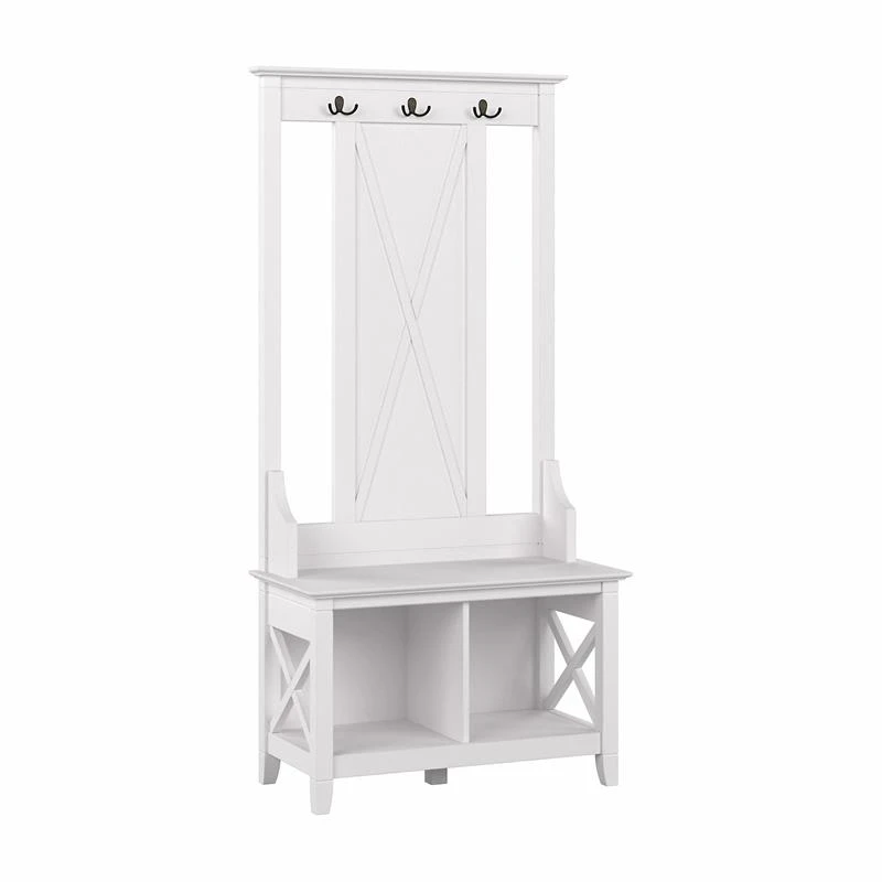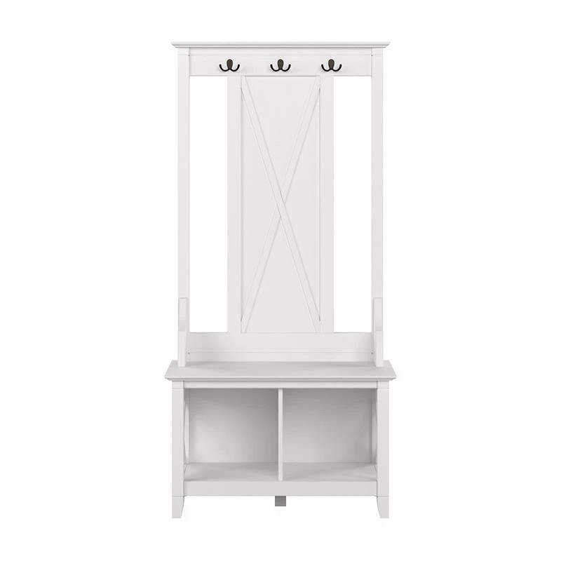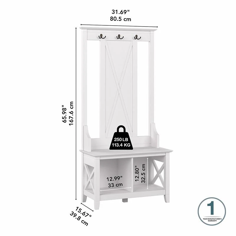 The Bush Furniture Key West Hall Tree with Shoe Storage Bench offers an entryway solution that gives your home a touch of casual style. This entryway organizer has space for shoes, outerwear and accessories so they’re right where you need them when it’s time to go. The Hall Tree includes three double-prong coat hooks for hanging jackets, hats, scarves and more. The Shoe Bench supports up to 250 pounds, so you can take a seat while putting on or removing footwear. Stash your sneakers, boots and other shoes inside the open compartment underneath the Storage Bench to maintain a clutter-free mudroom. Unique X pattern accents convey a casual appearance that works well with cottage, coastal and modern farmhouse style. This entryway bench and hall tree set has been rigorously tested to meet Bush Furniture’s standards for safety, durability and performance and is backed by a 1 Year Warranty. Materials: Engineered wood and Laminates