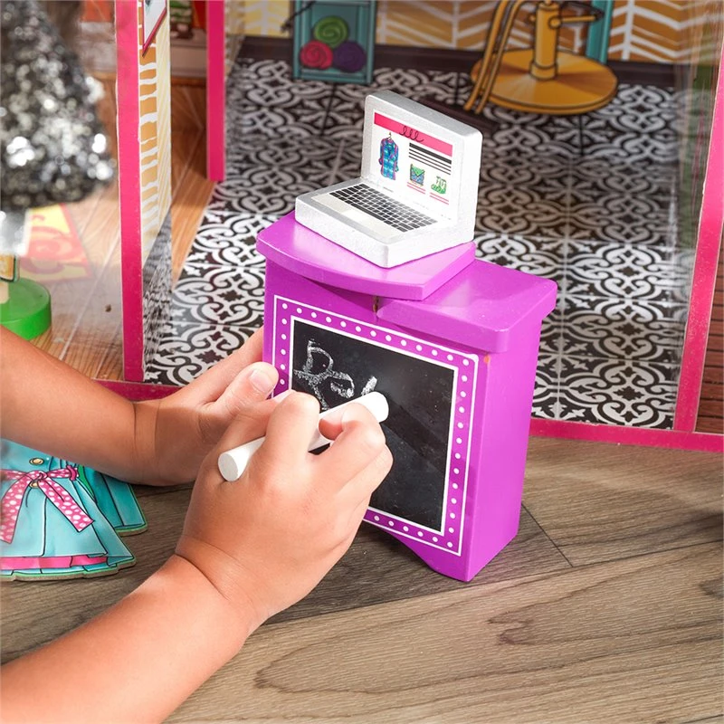 Bring uptown charm to classic playtime with the KidKraft Brooklyn’s Loft Dollhouse. Standing over three feet tall, with three levels and six unique rooms, kids will love this urban retreat. Dolls access the third in floor attic loft via the exquisitely in detailed fire escape stairs. Below the living area and bathroom, three little shops await. Brooklyn’s Loft features a boutique, a salon and a café with a fabric awning, walk in up window and an impressive 25 in piece accessory kit with lights and sounds to outfit them. Innovative items in this set include a magnetic dress form with different outfits, a cake for the café and a cute little cat. Kids and their 12 in inch dolls will never run out of things to do in this fantastic addition to any playroom.