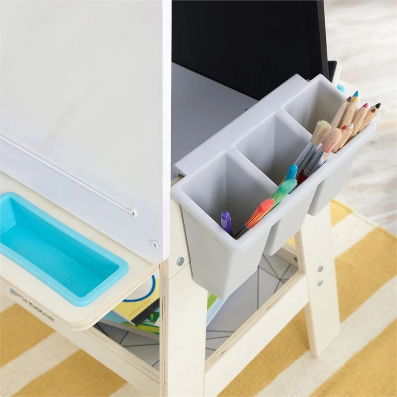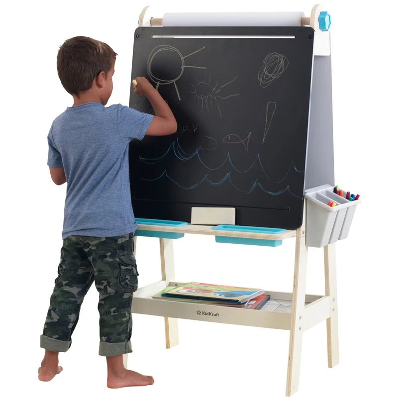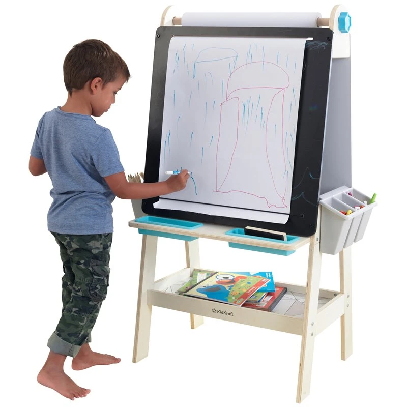 There’s no easier way to bring out the little Picasso in kids than with the extra-large and inspiring KidKraft Create N Play Art Easel! Packed with exciting features that tickle the senses, this 360° art easel offers more than one way to play with its dual chalkboard and whiteboard sides — perfect for more than multiple artists to use at the same time. When young artists are ready create paint, pencil, crayon and marker masterpieces, all mom and dad have to do is pull a sheet of paper down from the top holder and secure the paper in place with easy-to-use bungee cords. Let paintings dry on the bottom rack, and then store them in the hidden storage space in the center of the easel. Not only does this multi-play easel feed creativity, but it also teaches the importance of organization with the pencil trays and side hanging organizers. Made from quality material, the durable and exciting KidKraft Create N Play Art Easel is a work of art that belongs in every child’s bedroom or playroom!