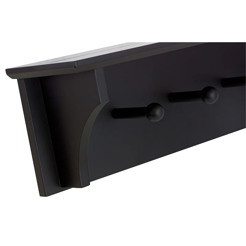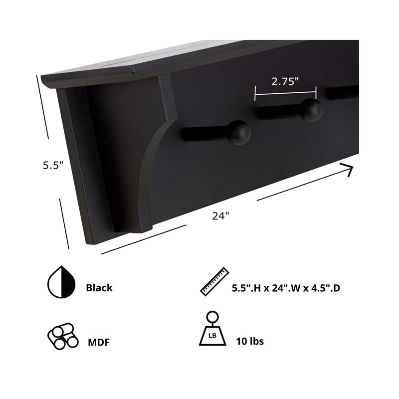 kieragrace KG Traditional Foster Wall Shelf with 5 Pegs Black Engineered Wood features 5 sturdy pegs and 1 integrated display shelf. It is perfect for entryway organization, bathroom, kitchen, or bedrooms. Hang your keys, leashes, accessories, hats, scarves, coats, towels and anything you want! Display your favorite decorative items in style. Easy to hang, this shelf comes assembled with hanging hardware.
