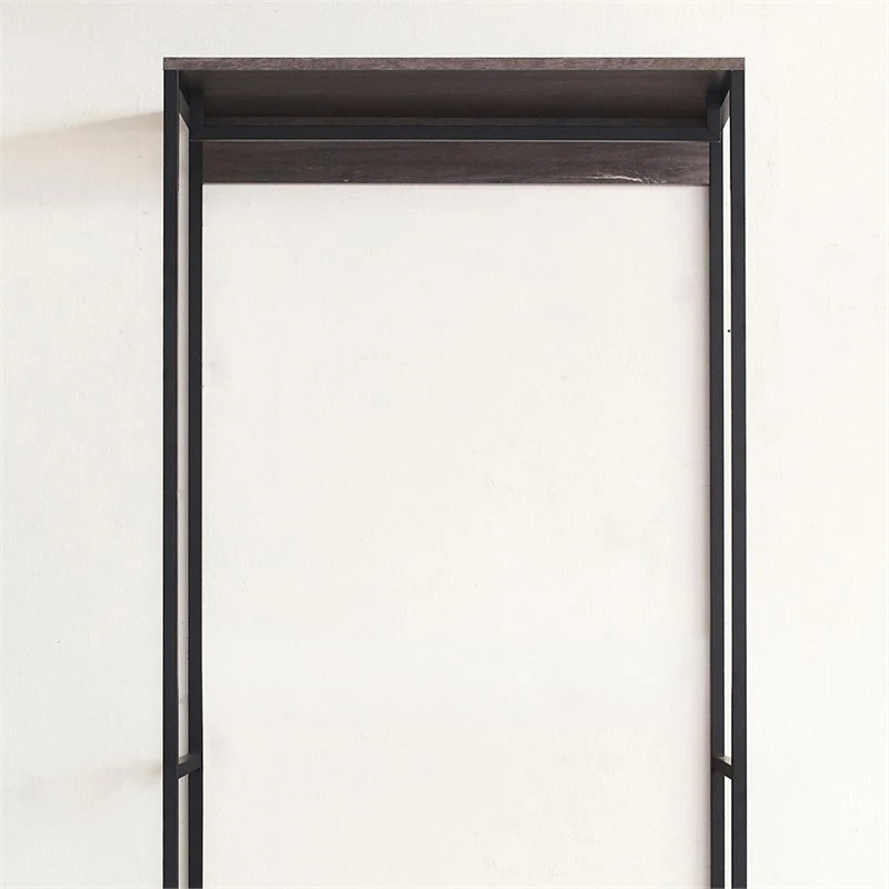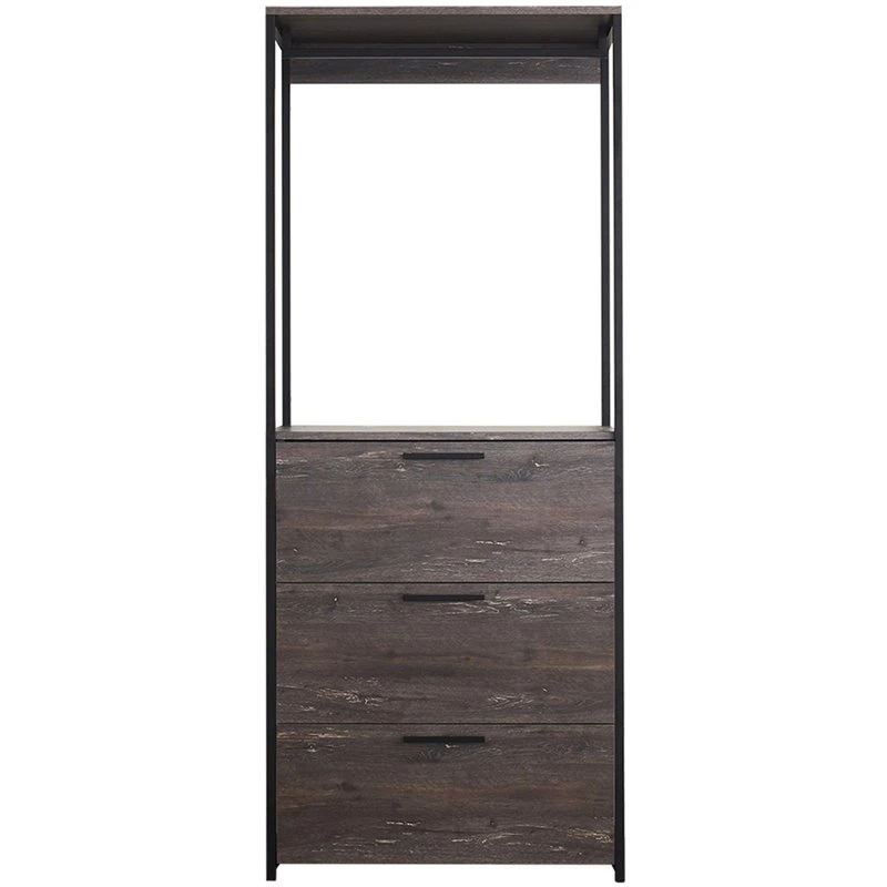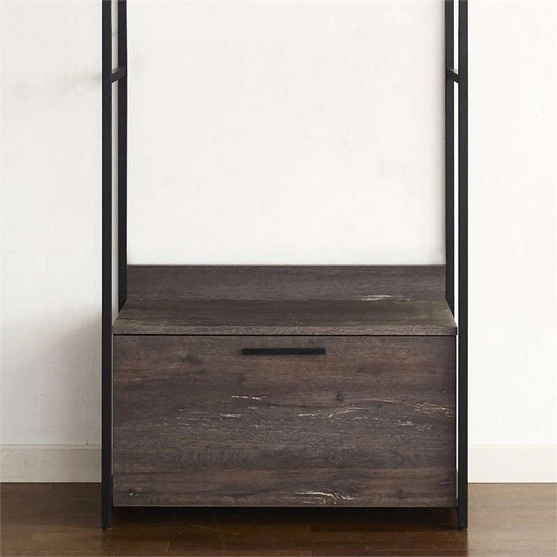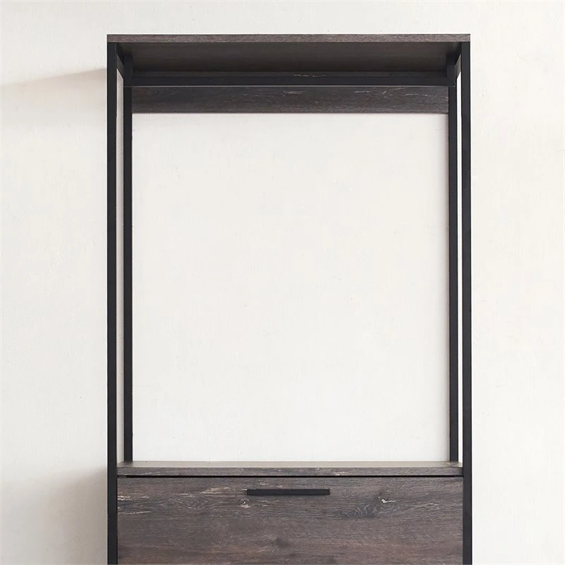 Configure your closet in the way that suits you best with this walk-in closet organizer with one drawer. A spacious drawer provides space to store purses, shoes, and other essential items. A weathered wood appearance with a black metal frame will have you organizing your closet in style.
