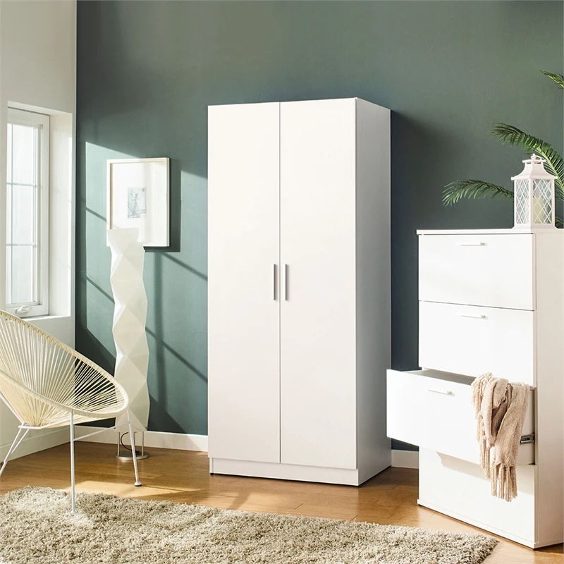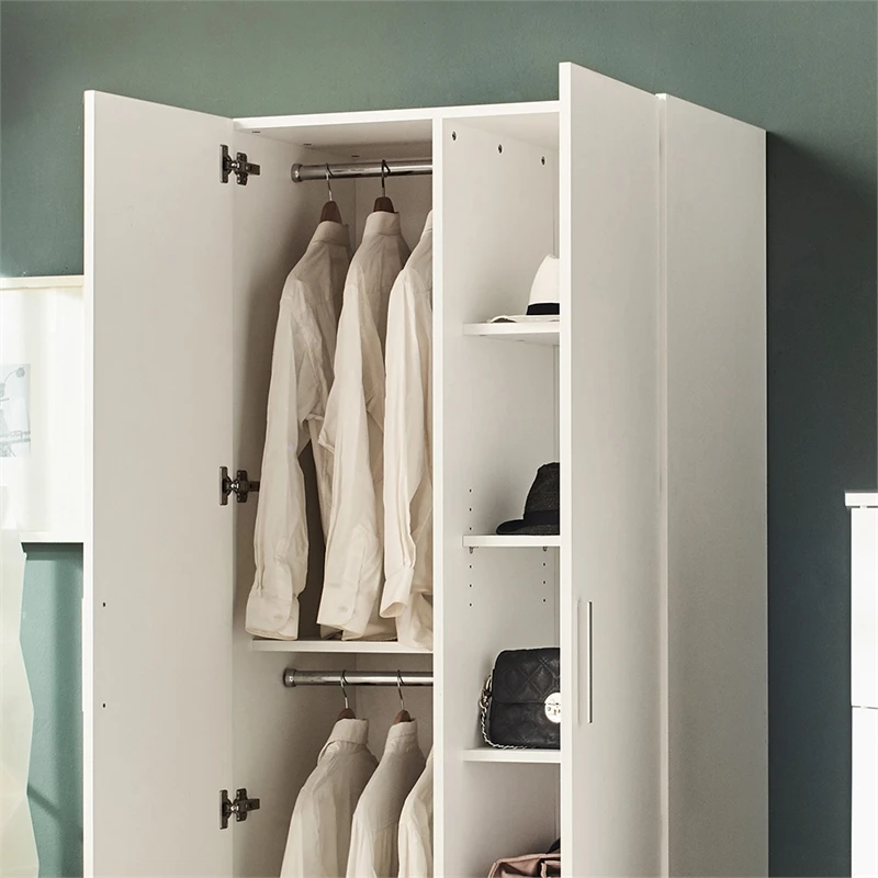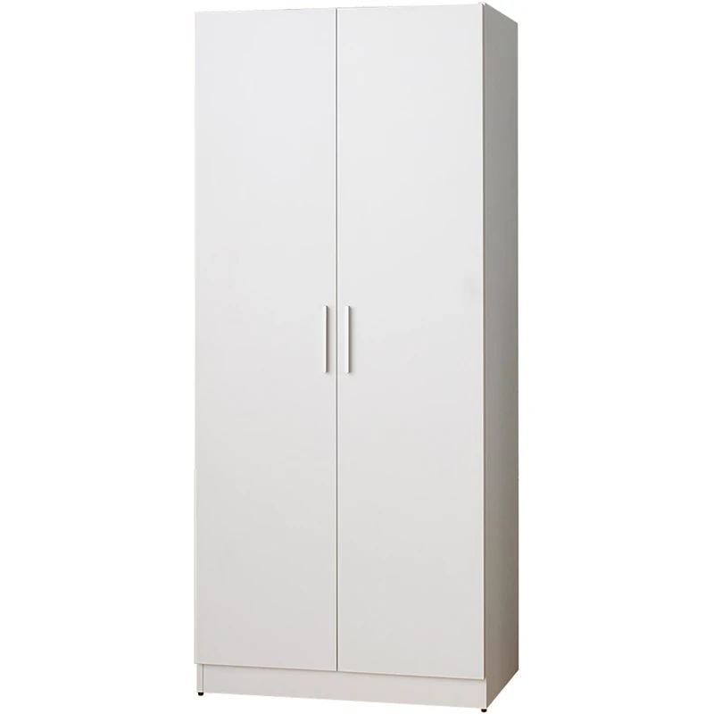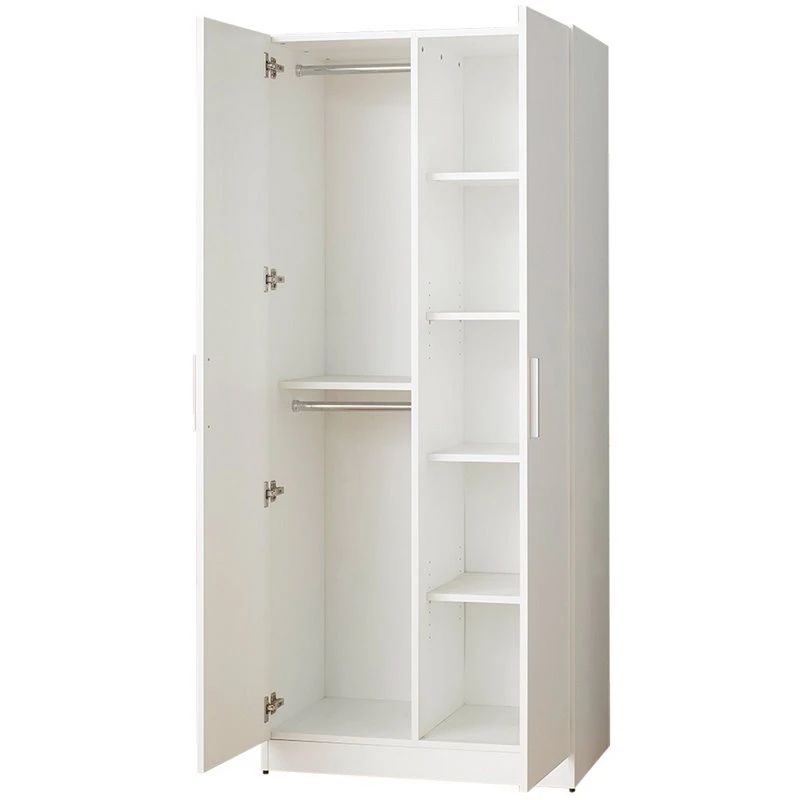Versatile and spacious, this wood closet in white offers a neat and organized area for storage. Hanging clothing on the included bar will keep clothing wrinkle free, while five shelving units organize items such as shoes, hats, and more. Close the two large cabinet doors to conceal items out of sight.