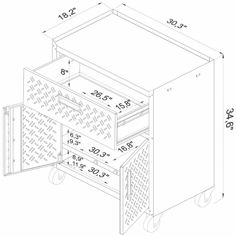 The Fortress Garage Collection gets its name for its durability, design, and craftsmanship. Included in the set is 3 highly functional units. The 2 Fortress Mobile Cabinets feature stainless steel swivel casters for easy mobility and a metal latch to lock wheels. Mobile cabinets also feature a space saving design as they fit perfectly under the Fortress Garage Table included in this set. Maximize your storage space with the Manhattan Comfort functional 3-Piece Fortress Garage Collection. Made with steel frames and textured doors.
