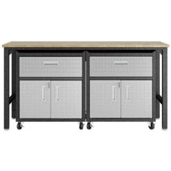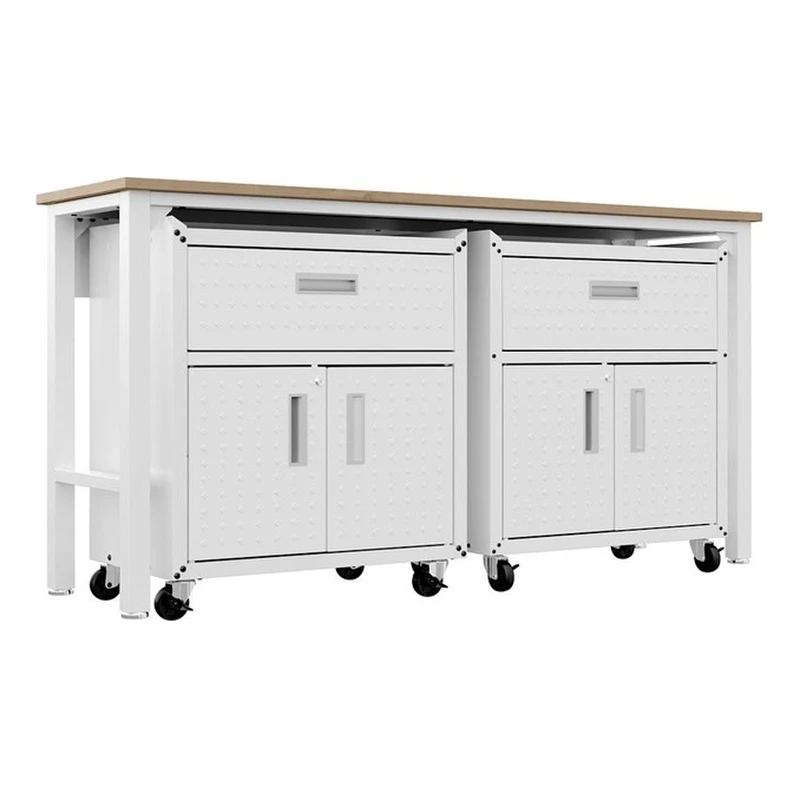 - Includes 2 Mobile Garage Cabinets with 1 Full Extension Drawer, and 2 Doors with 1 Adjustable Shelf, and 1 Worktable.