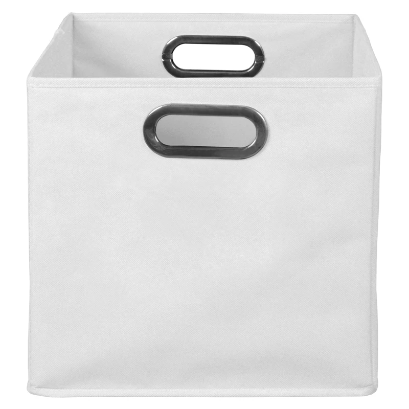 Find your Niche with versatile and modern Niche Fabric Storage Bins! Strong and durable, these bins each include a reinforced bottom panel that adds an extra layer of stability. With the bottom panel in place, they are sturdy enough to use on their own to hold files, scrapbook paper, children’s toys, towels, craft supplies and more. The bottom panel comes out and the entire bin folds flat for easy storage when not in use. Folded bins even fit perfectly inside an open one! Chrome handles are built into two sides of the bin, which makes carrying and moving it easy and worry-free. Inset handles are stronger than sewn-on cloth handles and won’t come unstitched or separate at the seams like cloth handles could. Measuring 12 x 12 x 12, Niche Fabric Bins are truly square and integrate seamlessly into Niche Cubo storage cubes. They can be used in any direction- there is no “right” side to face front because all sides measure the same! Personalize your bins by using the clear label holder on one side. Quickly and easily identify contents or assign bins to individual students. Ideal for every room in the house, make this White Niche Folding Fabric Bin a part of your home or office today!