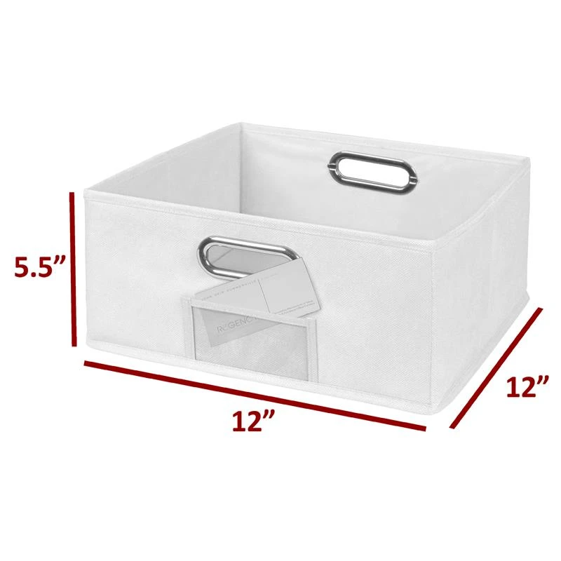 Find your Niche with versatile and modern Niche Fabric Storage Bins! Strong and durable, these bins each include a reinforced bottom panel that adds an extra layer of stability. With the bottom panel in place, they are sturdy enough to use on their own to hold paper, children’s toys, towels, toiletries, craft supplies and more. The bottom panel comes out and the entire bin folds flat for easy storage when not in use. Folded bins even fit perfectly inside an open one! Chrome handles are built into two sides of the bin, which makes carrying and moving it easy and worry-free. Inset handles are stronger than sewn-on cloth handles and won’t come unstitched or separate at the seams like cloth handles could. Measuring 12 x 12 x 5.5, Niche Half-Size Fabric Bins are truly square and integrate seamlessly into Niche Cubo storage cubes. They can be used in any direction- there is no “right” side to face front because all four sides measure the same! Personalize your bins by using the clear label holder on one side. Quickly and easily identify contents or assign bins to individual students. Ideal for every room in the house, make this set of 4 White Niche Half-Size Folding Fabric Bin a part of your home or office today!