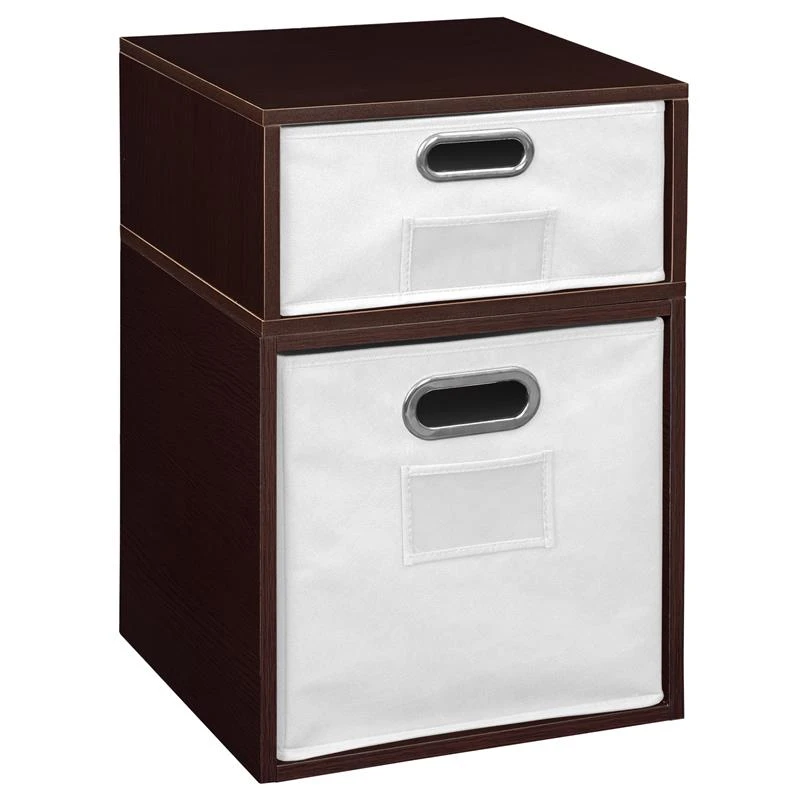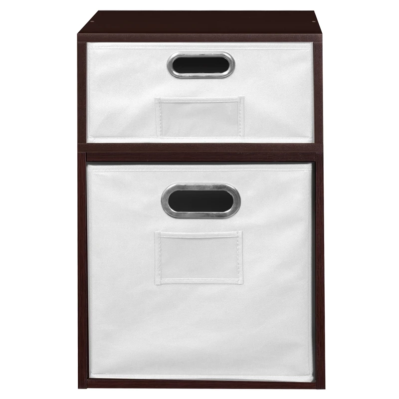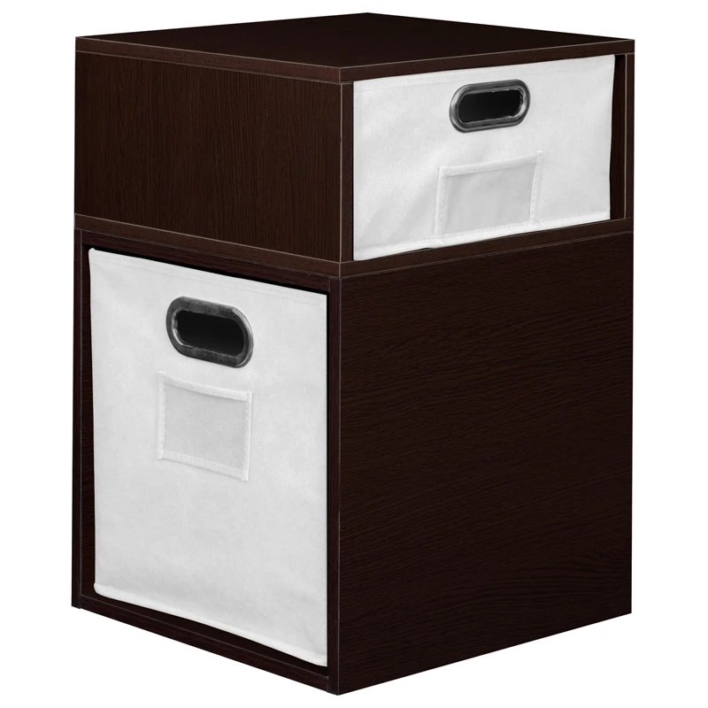 Let your creativity run wild with Cubo! This innovative set of 1 Full Size and 1 Half Size storage cubes by Niche are designed to fasten together in any direction! Connect them in any way you like. In a row, in a pyramid, in a U or L shape or countless other configurations. Cubes connect to one another with spring pins, making it easy to customize and create a storage system just for you with a single cube to a set of 12 or more. Niche storage cubes are actually cubes! They can be used in any direction. There’s no “right” way to use them because all sides measure the same! Who ever said all cubes had to face the front like a bookcase? Cubo storage cubes can attach together in any direction, which opens up a myriad of new design possibilities. Turn one to the right, turn another to the left. Keep one facing front and still another facing the back. Perfect to clean up clutter in closets, entryways, laundry & storage rooms, as a bookcase, nightstand or media storage, in a classroom or children’s room-these cubes fit anywhere! Its rich dark Truffle finish shows subtle wood grain and is sure to please and coordinates with the rest of the Niche line. No tools LockDowel assembly allows pieces to simply snap together and lock into place for a sturdy, hassle-free build in less than 2 minutes. No more searching for the right size screwdriver or dropping tiny screws. Just snap into place and go. Less hardware and fewer small parts means less plastic packaging and less waste. Arrange and rearrange the White Foldable Fabric Bins for a fresh, new custom look whenever you like!