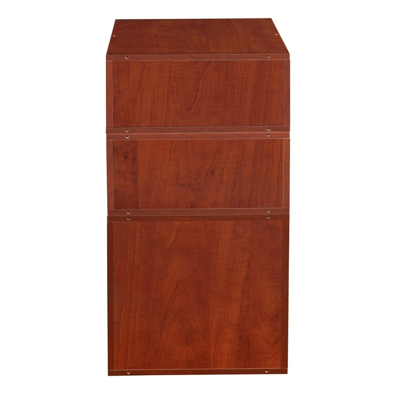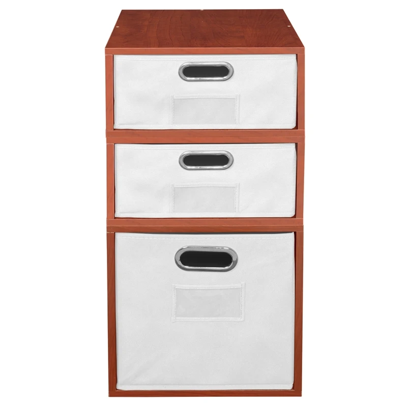 Let your creativity run wild with Cubo! This innovative set of 1 Full Size and 2 Half Size storage cubes by Niche are designed to fasten together in any direction! Connect them in any way you like. In a row, in a pyramid, in a U or L shape or countless other configurations. Cubes connect to one another with spring pins, making it easy to customize and create a storage system just for you with a single cube to a set of 12 or more. Niche storage cubes are actually cubes! They can be used in any direction. There’s no “right” way to use them because all sides measure the same! Who ever said all cubes had to face the front like a bookcase? Cubo storage cubes can attach together in any direction, which opens up a myriad of new design possibilities. Turn one to the right, turn another to the left. Keep one facing front and still another facing the back. Perfect to clean up clutter in closets, entryways, laundry & storage rooms, as a bookcase, nightstand or media storage, in a classroom or children’s room-these cubes fit anywhere! Its rich Cherry finish shows subtle wood grain and is sure to please and coordinates with the rest of the Niche line. No tools LockDowel assembly allows pieces to simply snap together and lock into place for a sturdy, hassle-free build in less than 2 minutes. No more searching for the right size screwdriver or dropping tiny screws. Just snap into place and go. Less hardware and fewer small parts means less plastic packaging and less waste. Arrange and rearrange the White Foldable Fabric Bins for a fresh, new custom look whenever you like!