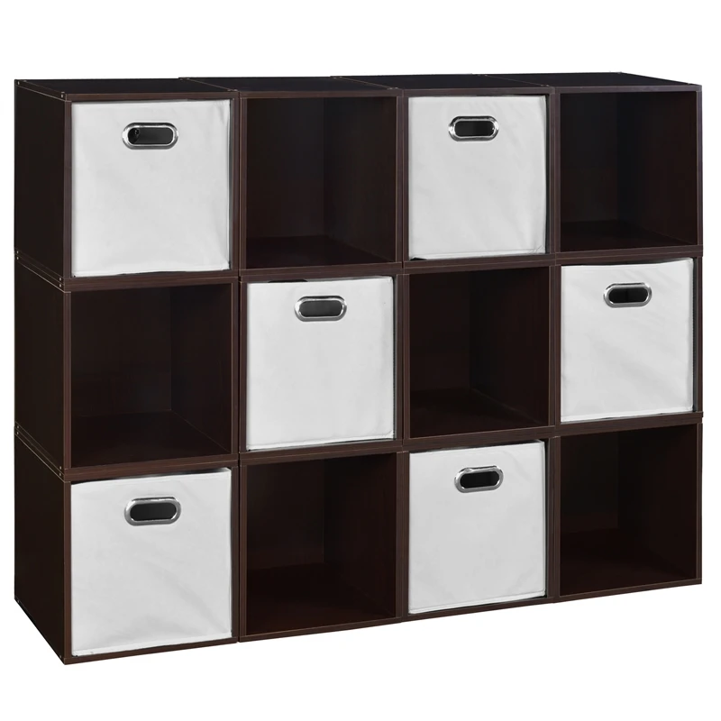 Let your creativity run wild with Cubo! This innovative set of 12 storage cubes by Niche are designed to fasten together in any direction! Connect them in any way you like. In a row, in a pyramid, in a U or L shape or countless other configurations. Start small and add on later. Cubes connect to one another with spring pins, making it easy to customize and create a storage system just for you with a single cube to a set of 12 or more. Niche storage cubes are actually cubes! The Fabric Storage Bins measure 12 x 12 x 12, which integrate seamlessly into Niche Cubo storage cubes (interior dimensions 12 1/8″ x 12 1/8″ x 12 1/8″). There’s no “right” way to use them because all sides measure the same! Who ever said all cubes had to face the front like a bookcase? Cubo storage cubes can attach together in any direction, which opens up a myriad of new design possibilities. Turn one to the right, turn another to the left. Keep one facing front and still another facing the back. Perfect to clean up clutter in closets, entryways, laundry & storage rooms, as a bookcase, nightstand or media storage, in a classroom or children’s room-these cubes fit anywhere! Its rich dark Truffle finish shows subtle wood grain and is sure to please and coordinates with the rest of the Niche line. No tools LockDowel assembly allows pieces to simply snap together and lock into place for a sturdy, hassle-free build in less than 2 minutes. No more searching for the right size screwdriver or dropping tiny screws. Just snap into place and go. Less hardware and fewer small parts means less plastic packaging and less waste. Arrange and rearrange the 6 White Foldable Fabric Bins for a fresh, new custom look whenever you like!