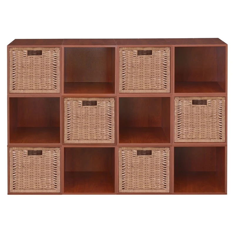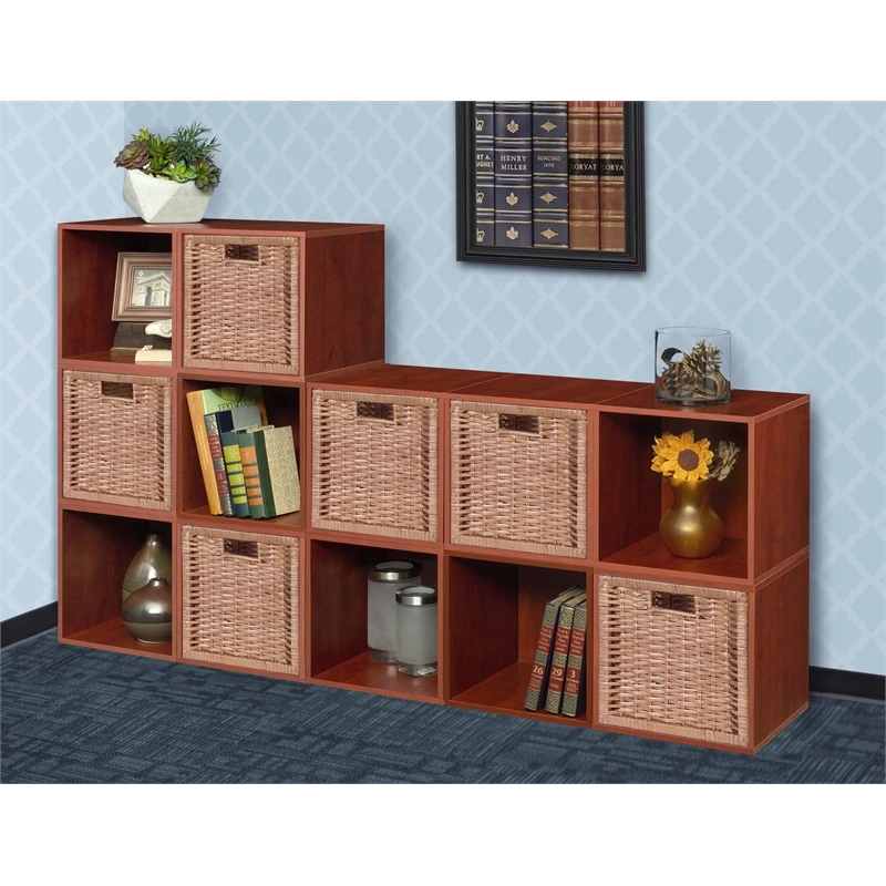 Let your creativity run wild with Cubo! This innovative set of 12 storage cubes by Niche are designed to fasten together in any direction! Connect them in any way you like. In a row, in a pyramid, in a U or L shape or countless other configurations. Start small and add on later. Cubes connect to one another with spring pins, making it easy to customize and create a storage system just for you with a single cube to a set of 12 or more. Niche storage cubes are actually cubes! The Wicker Storage Bins measures 12 x 12 x 12, which integrate seamlessly into Niche Cubo storage cubes (interior dimensions 12 1/8″ x 12 1/8″ x 12 1/8″). There’s no “right” way to use them because all sides measure the same! Who ever said all cubes had to face the front like a bookcase? Cubo storage cubes can attach together in any direction, which opens up a myriad of new design possibilities. Turn one to the right, turn another to the left. Keep one facing front and still another facing the back. Perfect to clean up clutter in closets, entryways, laundry & storage rooms, as a bookcase, nightstand or media storage, in a classroom or children’s room-these cubes fit anywhere! Its attractive Cherry finish shows subtle wood grain and is sure to please and coordinates with the rest of the Niche line. No tools LockDowel assembly allows pieces to simply snap together and lock into place for a sturdy, hassle-free build in less than 2 minutes. No more searching for the right size screwdriver or dropping tiny screws. Just snap into place and go. Less hardware and fewer small parts means less plastic packaging and less waste. Add, arrange or move around the Foldable Wicker Baskets for a fresh, new custom look whenever you like!