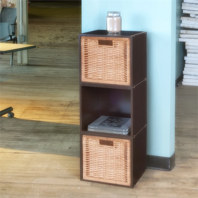 Let your creativity run wild with Cubo! This innovative set of 3 storage cubes by Niche are designed to fasten together in any direction! Connect them in any way you like. In a row, in a pyramid, in a U or L shape or countless other configurations. Start small and add on later. Cubes connect to one another with spring pins, making it easy to customize and create a storage system just for you with a single cube to a set of 12 or more. Niche storage cubes are actually cubes! The Wicker Storage Bins measures 12 x 12 x 12, which integrate seamlessly into Niche Cubo storage cubes (interior dimensions 12 1/8″ x 12 1/8″ x 12 1/8″). There’s no “right” way to use them because all sides measure the same! Who ever said all cubes had to face the front like a bookcase? Cubo storage cubes can attach together in any direction, which opens up a myriad of new design possibilities. Turn one to the right, turn another to the left. Keep one facing front and still another facing the back. Perfect to clean up clutter in closets, entryways, laundry & storage rooms, as a bookcase, nightstand or media storage, in a classroom or children’s room-these cubes fit anywhere! Its rich Truffle finish shows subtle wood grain and is sure to please and coordinates with the rest of the Niche line. No tools LockDowel assembly allows pieces to simply snap together and lock into place for a sturdy, hassle-free build in less than 2 minutes. No more searching for the right size screwdriver or dropping tiny screws. Just snap into place and go. Less hardware and fewer small parts means less plastic packaging and less waste. Add, arrange or move around the Foldable Wicker Baskets for a fresh, new custom look whenever you like!