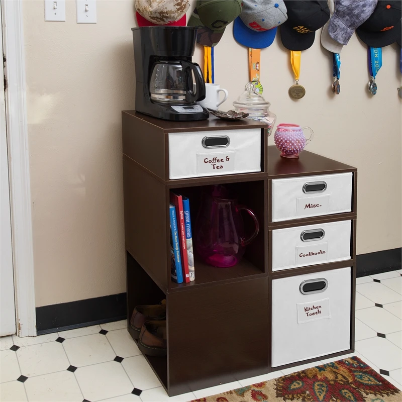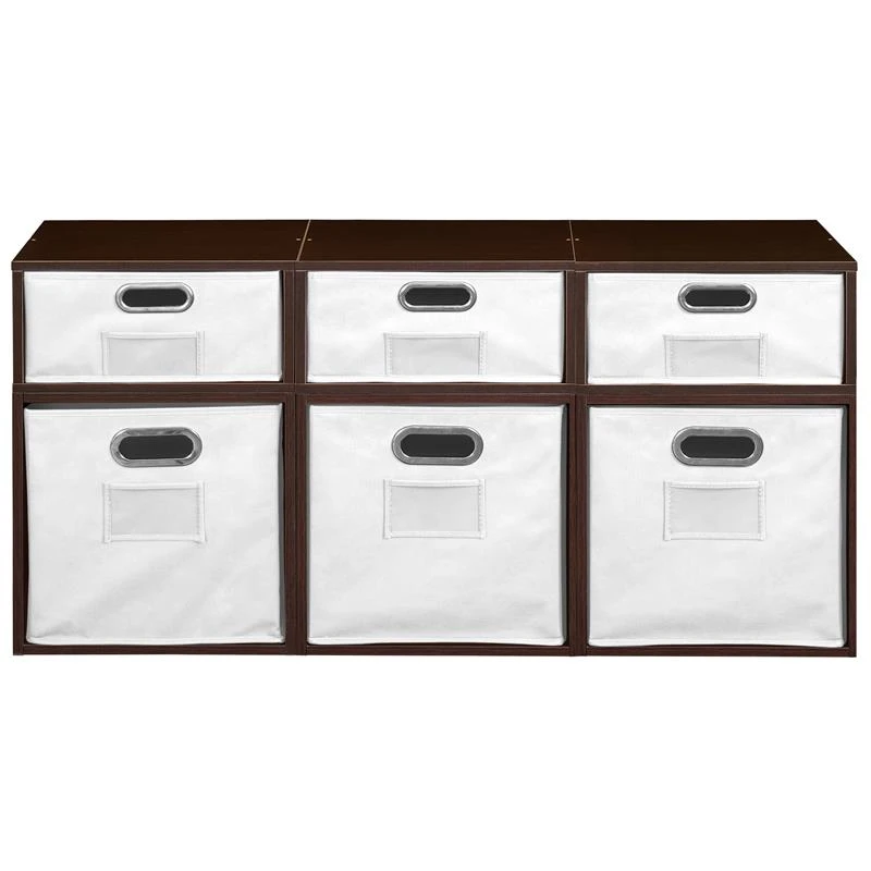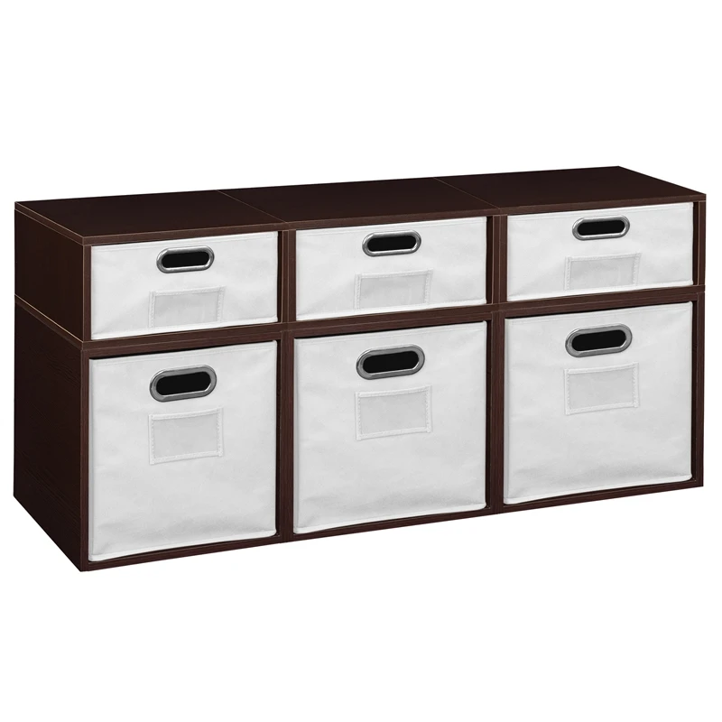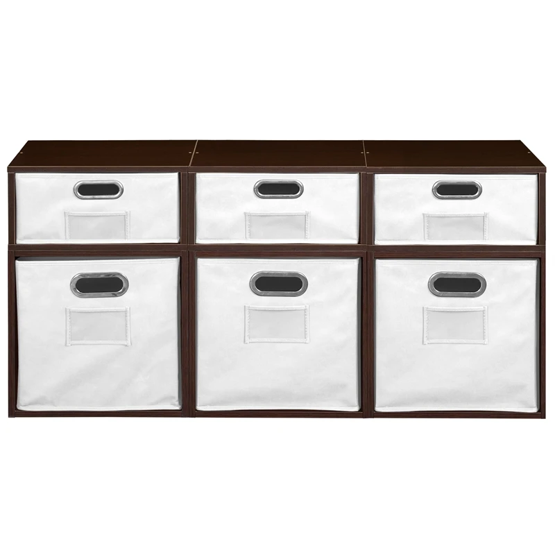Let your creativity run wild with Cubo! This innovative set of 3 Full Size and 3 Half Size storage cubes by Niche are designed to fasten together in any direction! Connect them in any way you like. In a row, in a pyramid, in a U or L shape or countless other configurations. Cubes connect to one another with spring pins, making it easy to customize and create a storage system just for you with a single cube to a set of 12 or more. Niche storage cubes are actually cubes! They can be used in any direction. There’s no “right” way to use them because all sides measure the same! Who ever said all cubes had to face the front like a bookcase? Cubo storage cubes can attach together in any direction, which opens up a myriad of new design possibilities. Turn one to the right, turn another to the left. Keep one facing front and still another facing the back. Perfect to clean up clutter in closets, entryways, laundry & storage rooms, as a bookcase, nightstand or media storage, in a classroom or children’s room-these cubes fit anywhere! Its rich dark Truffle finish shows subtle wood grain and is sure to please and coordinates with the rest of the Niche line. No tools LockDowel assembly allows pieces to simply snap together and lock into place for a sturdy, hassle-free build in less than 2 minutes. No more searching for the right size screwdriver or dropping tiny screws. Just snap into place and go. Less hardware and fewer small parts means less plastic packaging and less waste. Arrange and rearrange the White Foldable Fabric Bins for a fresh, new custom look whenever you like!