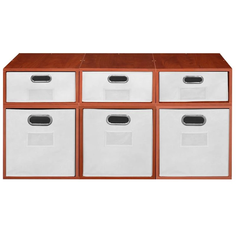 Let your creativity run wild with Cubo! This innovative set of 3 Full Size and 3 Half Size storage cubes by Niche are designed to fasten together in any direction! Connect them in any way you like. In a row, in a pyramid, in a U or L shape or countless other configurations. Cubes connect to one another with spring pins, making it easy to customize and create a storage system just for you with a single cube to a set of 12 or more. Niche storage cubes are actually cubes! They can be used in any direction. There’s no “right” way to use them because all sides measure the same! Who ever said all cubes had to face the front like a bookcase? Cubo storage cubes can attach together in any direction, which opens up a myriad of new design possibilities. Turn one to the right, turn another to the left. Keep one facing front and still another facing the back. Perfect to clean up clutter in closets, entryways, laundry & storage rooms, as a bookcase, nightstand or media storage, in a classroom or children’s room-these cubes fit anywhere! Its rich Cherry finish shows subtle wood grain and is sure to please and coordinates with the rest of the Niche line. No tools LockDowel assembly allows pieces to simply snap together and lock into place for a sturdy, hassle-free build in less than 2 minutes. No more searching for the right size screwdriver or dropping tiny screws. Just snap into place and go. Less hardware and fewer small parts means less plastic packaging and less waste. Arrange and rearrange the White Foldable Fabric Bins for a fresh, new custom look whenever you like!