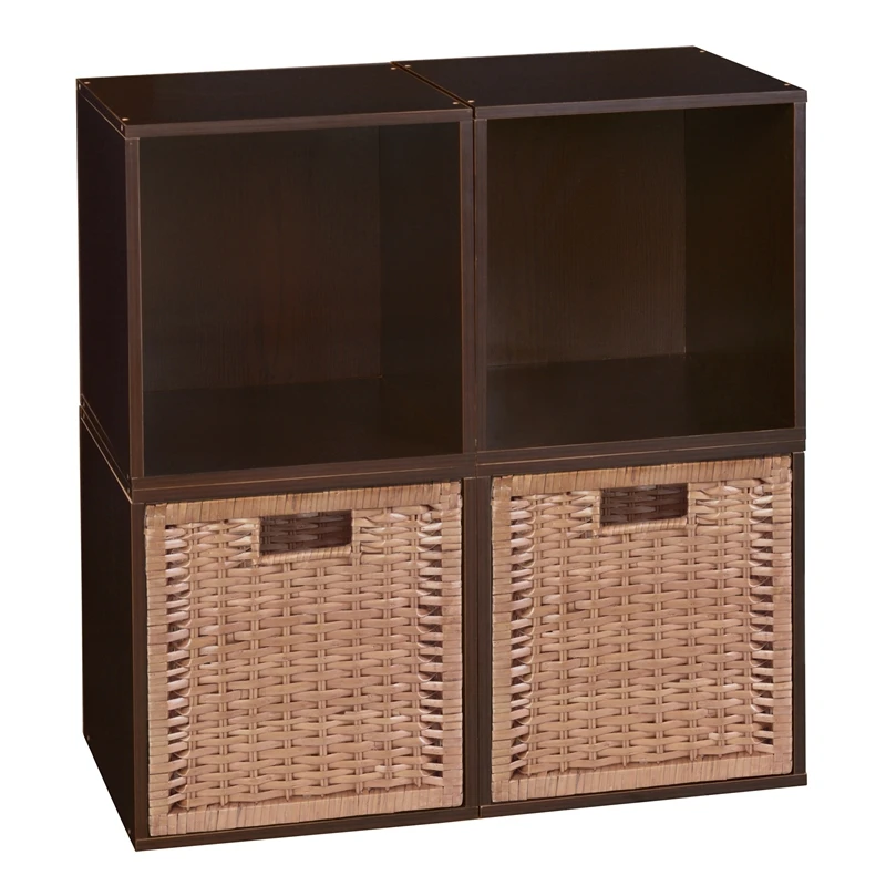 Let your creativity run wild with Cubo! This innovative set of 4 storage cubes by Niche are designed to fasten together in any direction! Connect them in any way you like. In a row, in a pyramid, in a U or L shape or countless other configurations. Start small and add on later. Cubes connect to one another with spring pins, making it easy to customize and create a storage system just for you with a single cube to a set of 12 or more. Niche storage cubes are actually cubes! The Wicker Storage Bins measures 12 x 12 x 12, which integrate seamlessly into Niche Cubo storage cubes (interior dimensions 12 1/8″ x 12 1/8″ x 12 1/8″). There’s no “right” way to use them because all sides measure the same! Who ever said all cubes had to face the front like a bookcase? Cubo storage cubes can attach together in any direction, which opens up a myriad of new design possibilities. Turn one to the right, turn another to the left. Keep one facing front and still another facing the back. Perfect to clean up clutter in closets, entryways, laundry & storage rooms, as a bookcase, nightstand or media storage, in a classroom or children’s room-these cubes fit anywhere! Its rich Truffle finish shows subtle wood grain and is sure to please and coordinates with the rest of the Niche line. No tools LockDowel assembly allows pieces to simply snap together and lock into place for a sturdy, hassle-free build in less than 2 minutes. No more searching for the right size screwdriver or dropping tiny screws. Just snap into place and go. Less hardware and fewer small parts means less plastic packaging and less waste. Add, arrange or move around the Foldable Wicker Baskets for a fresh, new custom look whenever you like!
