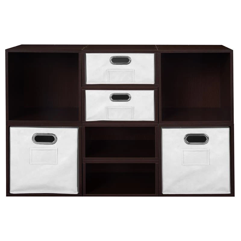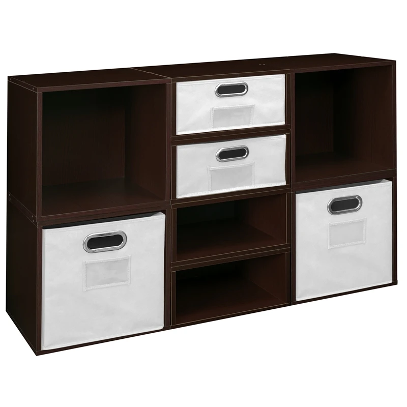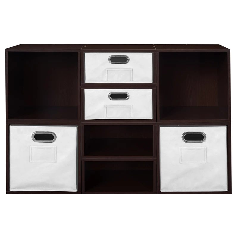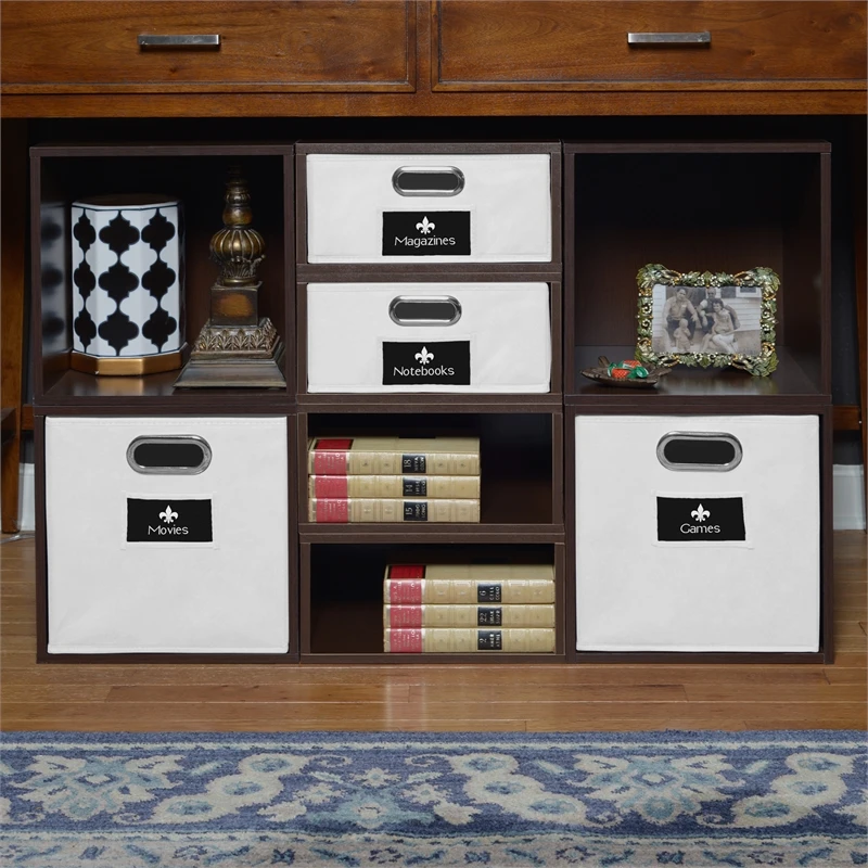 Let your creativity run wild with Cubo! This innovative set of 4 Full Size and 4 Half Size storage cubes by Niche are designed to fasten together in any direction! Connect them in any way you like. In a row, in a pyramid, in a U or L shape or countless other configurations. Cubes connect to one another with spring pins, making it easy to customize and create a storage system just for you with a single cube to a set of 12 or more. Niche storage cubes are actually cubes! They can be used in any direction. There’s no “right” way to use them because all sides measure the same! Who ever said all cubes had to face the front like a bookcase? Cubo storage cubes can attach together in any direction, which opens up a myriad of new design possibilities. Turn one to the right, turn another to the left. Keep one facing front and still another facing the back. Perfect to clean up clutter in closets, entryways, laundry & storage rooms, as a bookcase, nightstand or media storage, in a classroom or children’s room-these cubes fit anywhere! Its rich dark Truffle finish shows subtle wood grain and is sure to please and coordinates with the rest of the Niche line. No tools LockDowel assembly allows pieces to simply snap together and lock into place for a sturdy, hassle-free build in less than 2 minutes. No more searching for the right size screwdriver or dropping tiny screws. Just snap into place and go. Less hardware and fewer small parts means less plastic packaging and less waste. Arrange and rearrange the White Foldable Fabric Bins for a fresh, new custom look whenever you like!