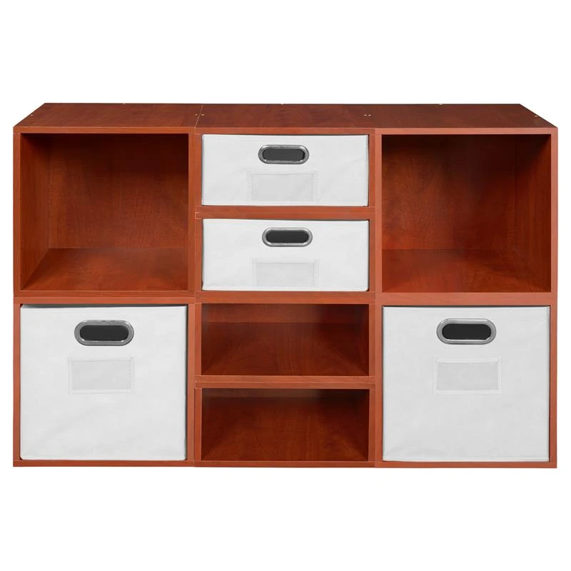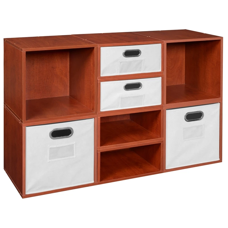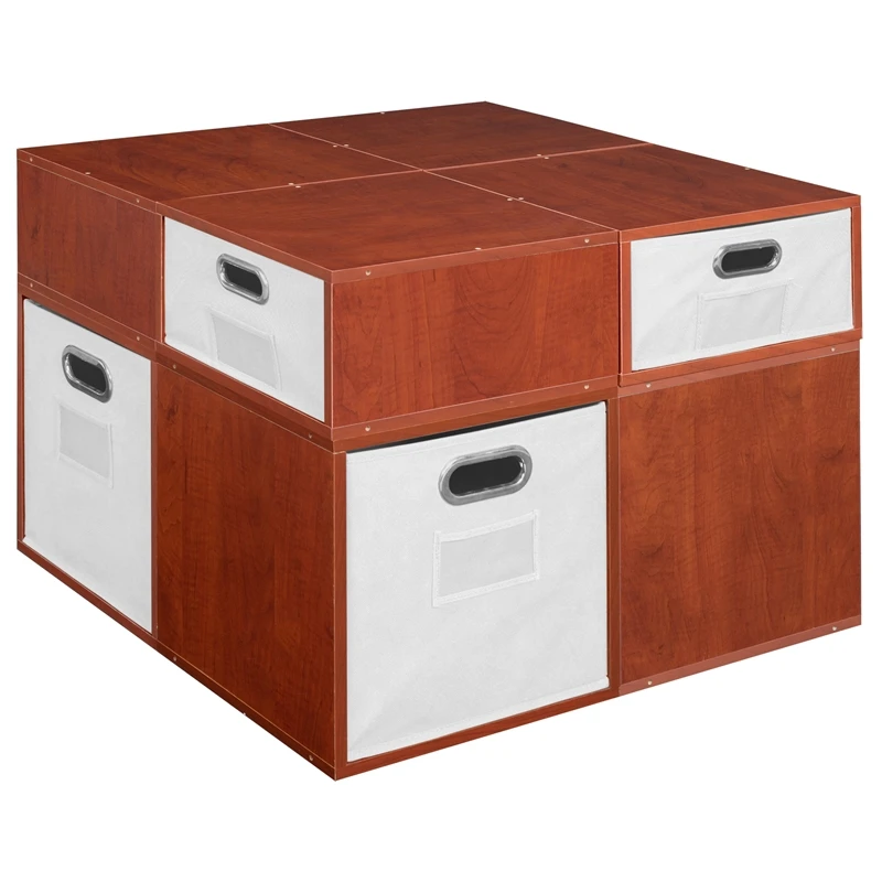 Let your creativity run wild with Cubo! This innovative set of 4 Full Size and 4 Half Size storage cubes by Niche are designed to fasten together in any direction! Connect them in any way you like. In a row, in a pyramid, in a U or L shape or countless other configurations. Cubes connect to one another with spring pins, making it easy to customize and create a storage system just for you with a single cube to a set of 12 or more. Niche storage cubes are actually cubes! They can be used in any direction. There’s no “right” way to use them because all sides measure the same! Who ever said all cubes had to face the front like a bookcase? Cubo storage cubes can attach together in any direction, which opens up a myriad of new design possibilities. Turn one to the right, turn another to the left. Keep one facing front and still another facing the back. Perfect to clean up clutter in closets, entryways, laundry & storage rooms, as a bookcase, nightstand or media storage, in a classroom or children’s room-these cubes fit anywhere! Its rich Cherry finish shows subtle wood grain and is sure to please and coordinates with the rest of the Niche line. No tools LockDowel assembly allows pieces to simply snap together and lock into place for a sturdy, hassle-free build in less than 2 minutes. No more searching for the right size screwdriver or dropping tiny screws. Just snap into place and go. Less hardware and fewer small parts means less plastic packaging and less waste. Arrange and rearrange the White Foldable Fabric Bins for a fresh, new custom look whenever you like!