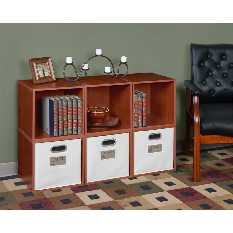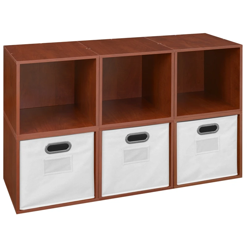 Let your creativity run wild with Cubo! This innovative set of 6 storage cubes by Niche are designed to fasten together in any direction! Connect them in any way you like. In a row, in a pyramid, in a U or L shape or countless other configurations. Start small and add on later. Cubes connect to one another with spring pins, making it easy to customize and create a storage system just for you with a single cube to a set of 12 or more. Niche storage cubes are actually cubes! The Fabric Storage Bins measure 12 x 12 x 12, which integrate seamlessly into Niche Cubo storage cubes (interior dimensions 12 1/8″ x 12 1/8″ x 12 1/8″). There’s no “right” way to use them because all sides measure the same! Who ever said all cubes had to face the front like a bookcase? Cubo storage cubes can attach together in any direction, which opens up a myriad of new design possibilities. Turn one to the right, turn another to the left. Keep one facing front and still another facing the back. Perfect to clean up clutter in closets, entryways, laundry & storage rooms, as a bookcase, nightstand or media storage, in a classroom or children’s room-these cubes fit anywhere! Its rich Cherry finish shows subtle wood grain and is sure to please and coordinates with the rest of the Niche line. No tools LockDowel assembly allows pieces to simply snap together and lock into place for a sturdy, hassle-free build in less than 2 minutes. No more searching for the right size screwdriver or dropping tiny screws. Just snap into place and go. Less hardware and fewer small parts means less plastic packaging and less waste. Arrange and rearrange the 3 White Foldable Fabric Bins for a fresh, new custom look whenever you like!