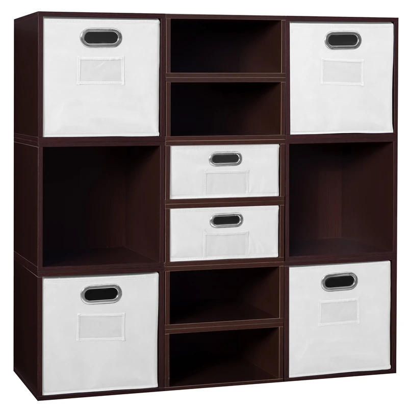 Let your creativity run wild with Cubo! This innovative set of 6 Full Size and 6 Half Size storage cubes by Niche are designed to fasten together in any direction! Connect them in any way you like. In a row, in a pyramid, in a U or L shape or countless other configurations. Cubes connect to one another with spring pins, making it easy to customize and create a storage system just for you with a single cube to a set of 12 or more. Niche storage cubes are actually cubes! They can be used in any direction. There’s no “right” way to use them because all sides measure the same! Who ever said all cubes had to face the front like a bookcase? Cubo storage cubes can attach together in any direction, which opens up a myriad of new design possibilities. Turn one to the right, turn another to the left. Keep one facing front and still another facing the back. Perfect to clean up clutter in closets, entryways, laundry & storage rooms, as a bookcase, nightstand or media storage, in a classroom or children’s room-these cubes fit anywhere! Its rich dark Truffle finish shows subtle wood grain and is sure to please and coordinates with the rest of the Niche line. No tools LockDowel assembly allows pieces to simply snap together and lock into place for a sturdy, hassle-free build in less than 2 minutes. No more searching for the right size screwdriver or dropping tiny screws. Just snap into place and go. Less hardware and fewer small parts means less plastic packaging and less waste. Arrange and rearrange the White Foldable Fabric Bins for a fresh, new custom look whenever you like!